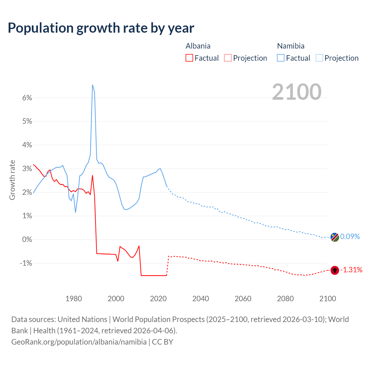 - For the last 10 years, Albania has had an average growth rate of -1.53% per year vs +2.73% in Namibia.
