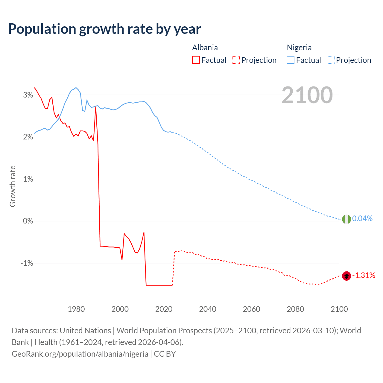 - For the last 10 years, Albania has had an average growth rate of -1.53% per year vs +2.31% in Nigeria.