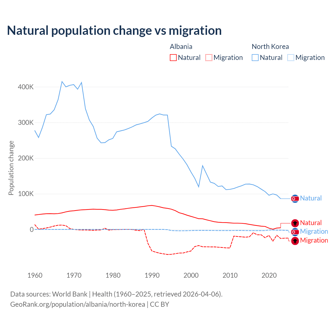 Over the last 10 years, 30% of the population change in Albania is from natural causes (a gain of 83,840 people) and 70% is from migration (a loss of 195,891 people). In North Korea 97.7% is from natural causes (a gain of 1,097,372 people) and 2.33% is from migration (a loss of 26,227 people).