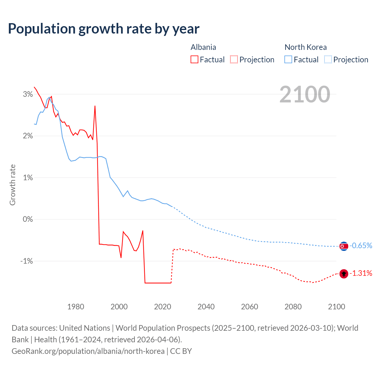 - For the last 10 years, Albania has had an average growth rate of -1.53% per year vs +0.41% in North Korea.