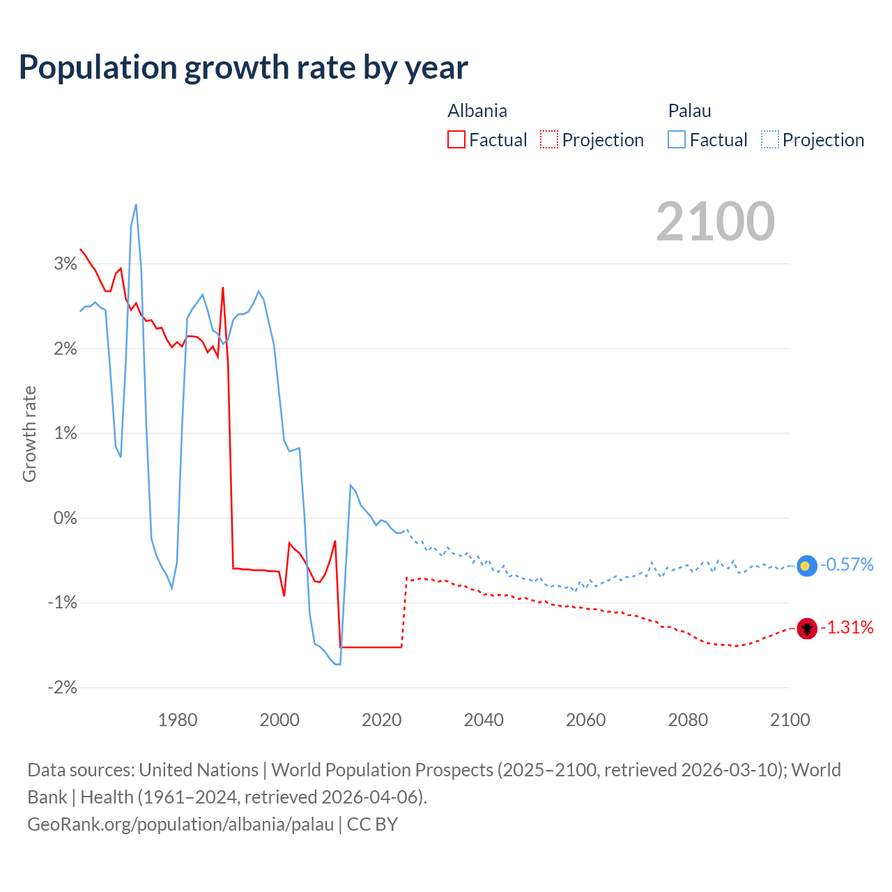 - For the last 10 years, Albania has had an average growth rate of -1.53% per year vs +0.02% in Palau.