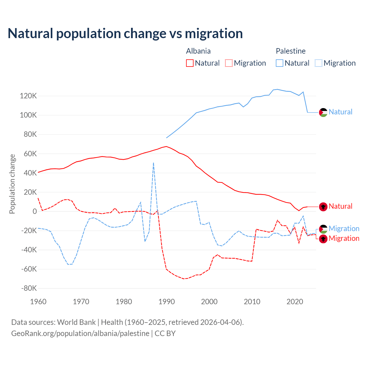 Over the last 10 years, 30% of the population change in Albania is from natural causes (a gain of 83,840 people) and 70% is from migration (a loss of 195,891 people). In Palestine 85.7% is from natural causes (a gain of 1,218,010 people) and 14.3% is from migration (a loss of 202,820 people).
