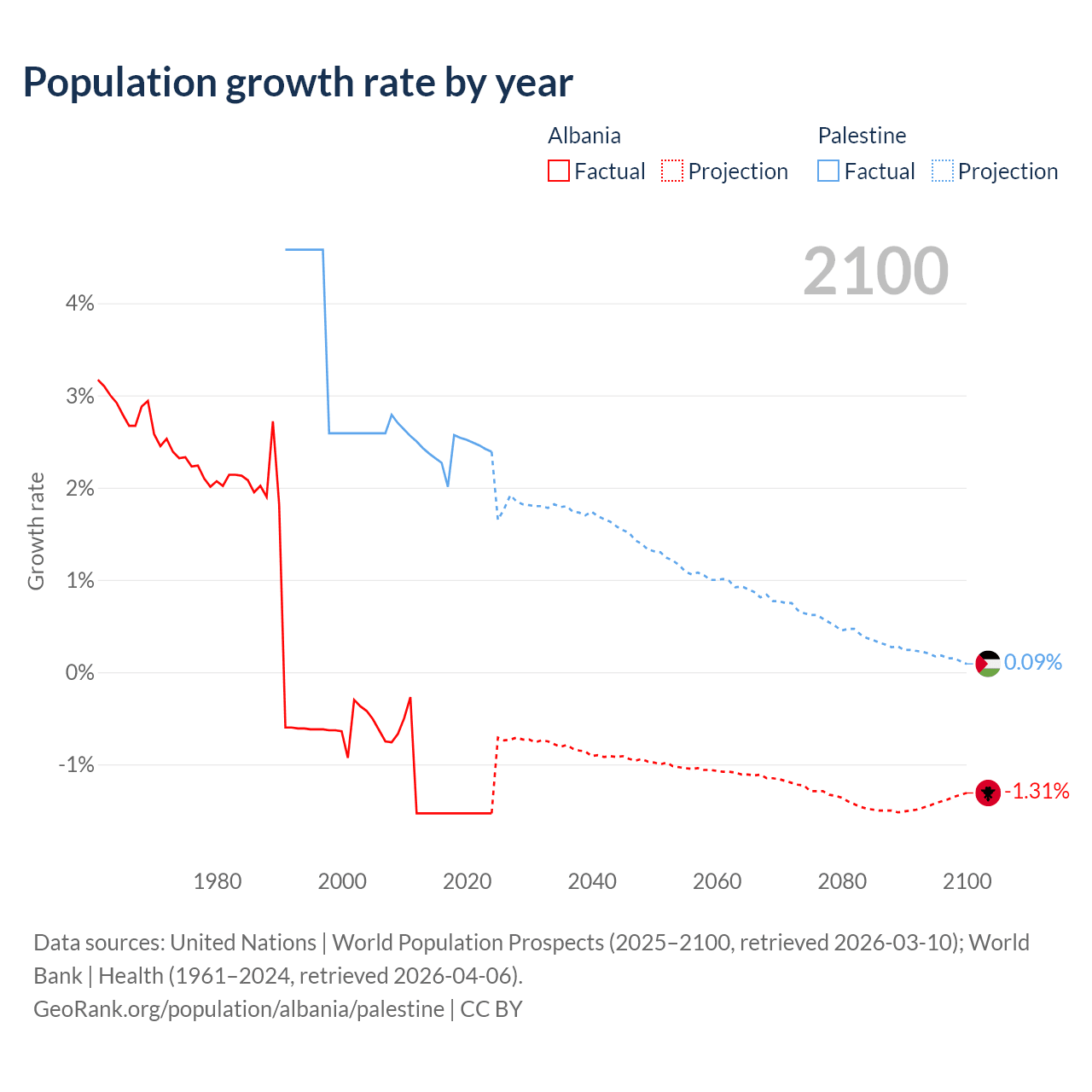 - For the last 10 years, Albania has had an average growth rate of -1.53% per year vs +2.4% in Palestine.