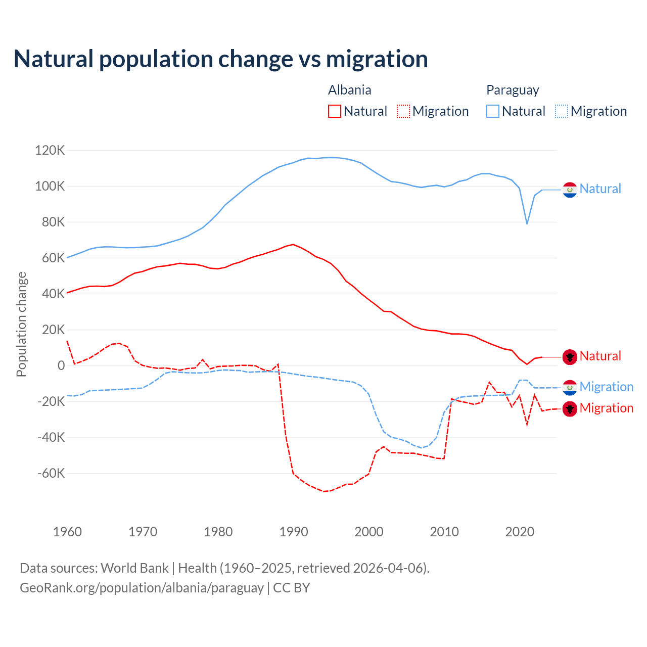 Over the last 10 years, 30% of the population change in Albania is from natural causes (a gain of 83,840 people) and 70% is from migration (a loss of 195,891 people). In Paraguay 87.6% is from natural causes (a gain of 1,002,636 people) and 12.4% is from migration (a loss of 141,377 people).