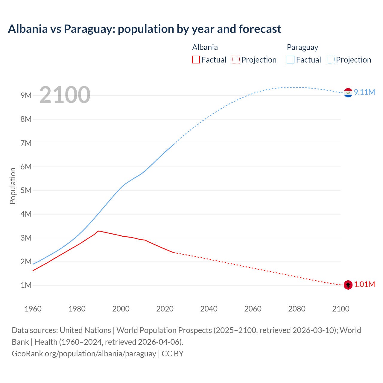 Albania vs Paraguay: population by year and forecast