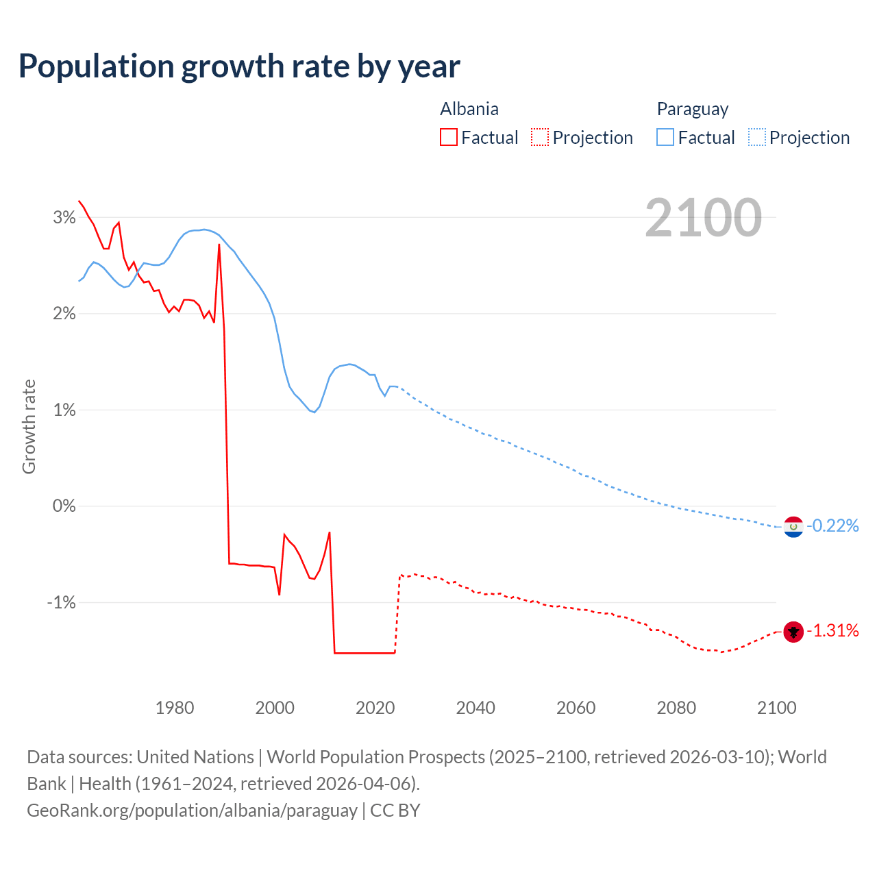 - For the last 10 years, Albania has had an average growth rate of -1.53% per year vs +1.34% in Paraguay.