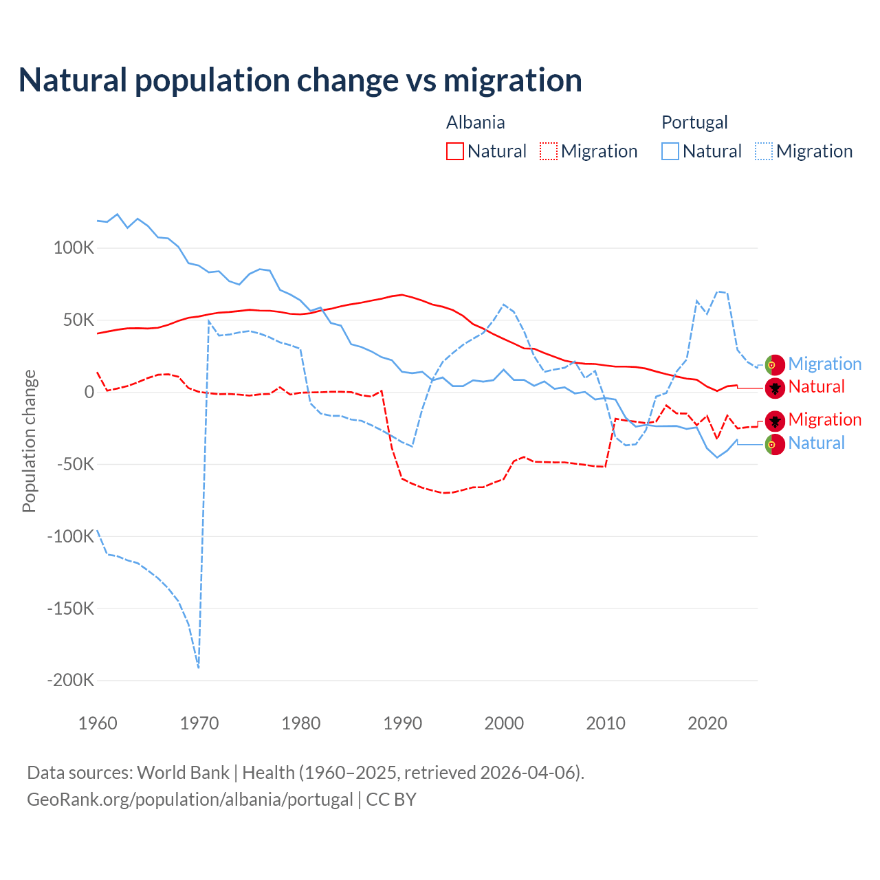 Over the last 10 years, 30% of the population change in Albania is from natural causes (a gain of 83,840 people) and 70% is from migration (a loss of 195,891 people). In Portugal 51% is from natural causes (a loss of 302,748 people) and 49% is from migration (a gain of 290,554 people).