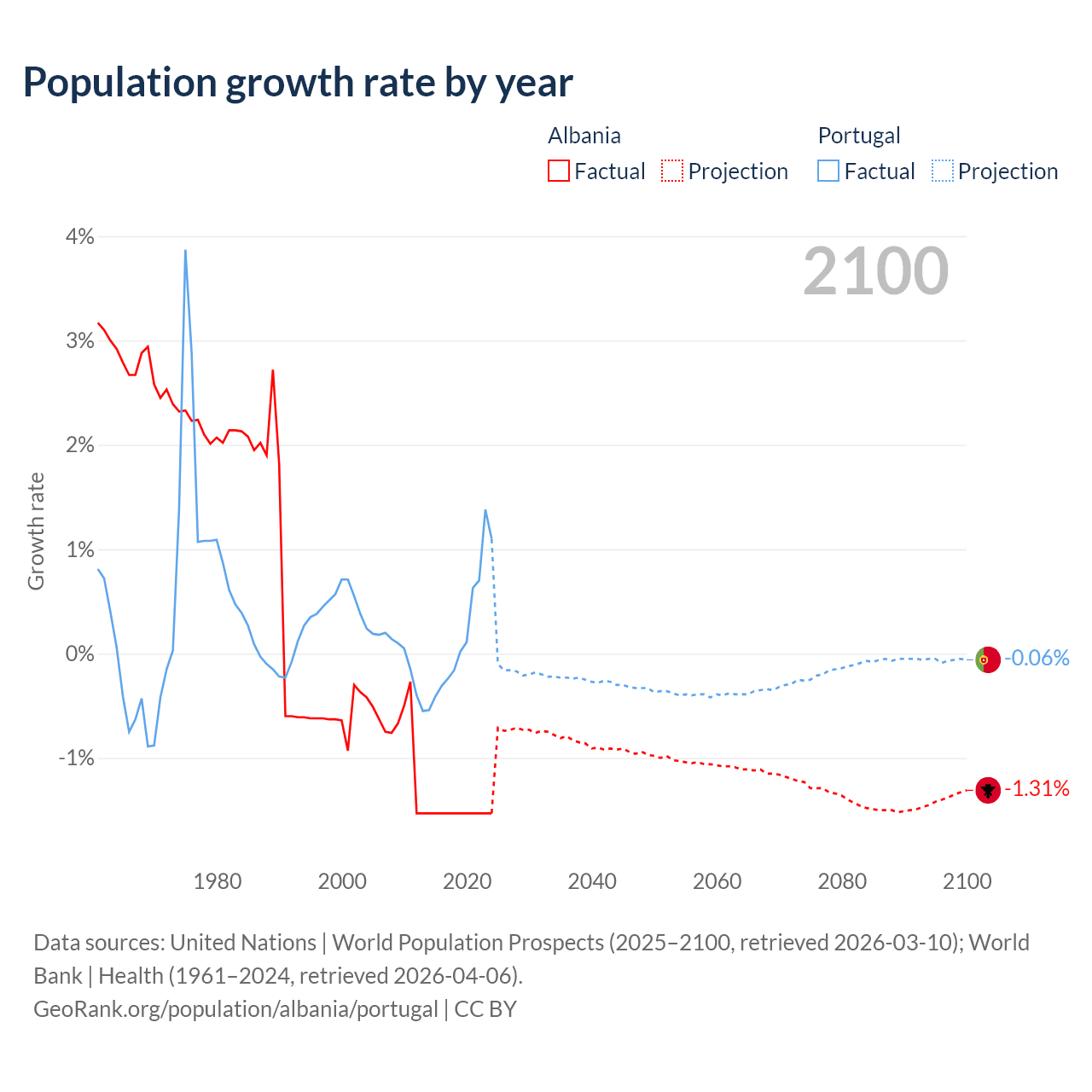 - For the last 10 years, Albania has had an average growth rate of -1.53% per year vs +0.21% in Portugal.