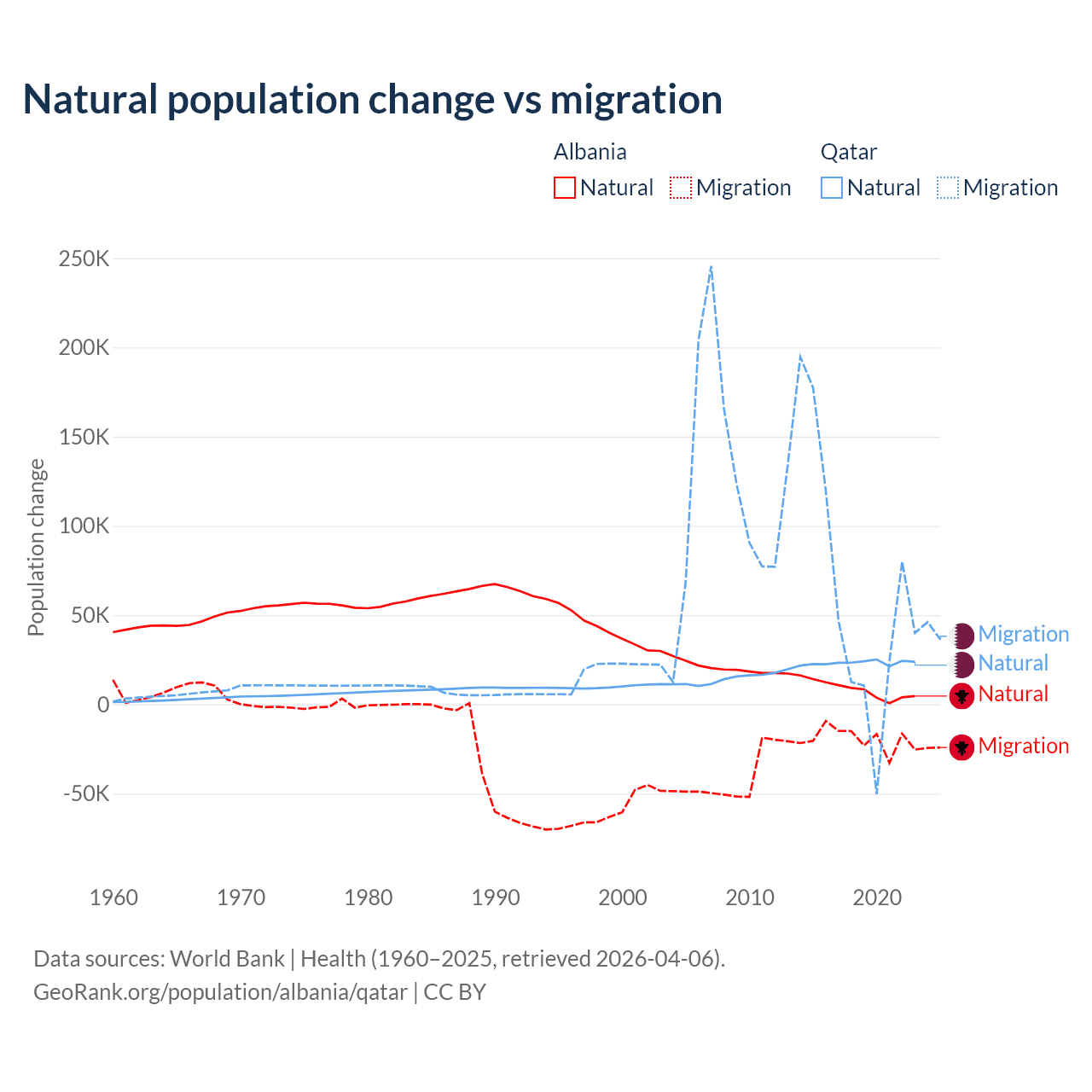 Over the last 10 years, 30% of the population change in Albania is from natural causes (a gain of 83,840 people) and 70% is from migration (a loss of 195,891 people). In Qatar 26.1% is from natural causes (a gain of 232,009 people) and 73.9% is from migration (a gain of 655,712 people).