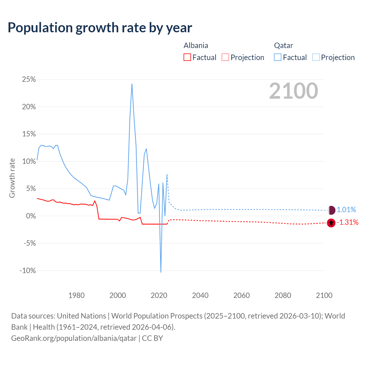 - For the last 10 years, Albania has had an average growth rate of -1.53% per year vs +3.86% in Qatar.