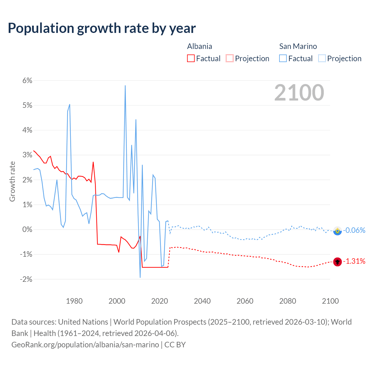 - For the last 10 years, Albania has had an average growth rate of -1.53% per year vs +0.26% in San Marino.