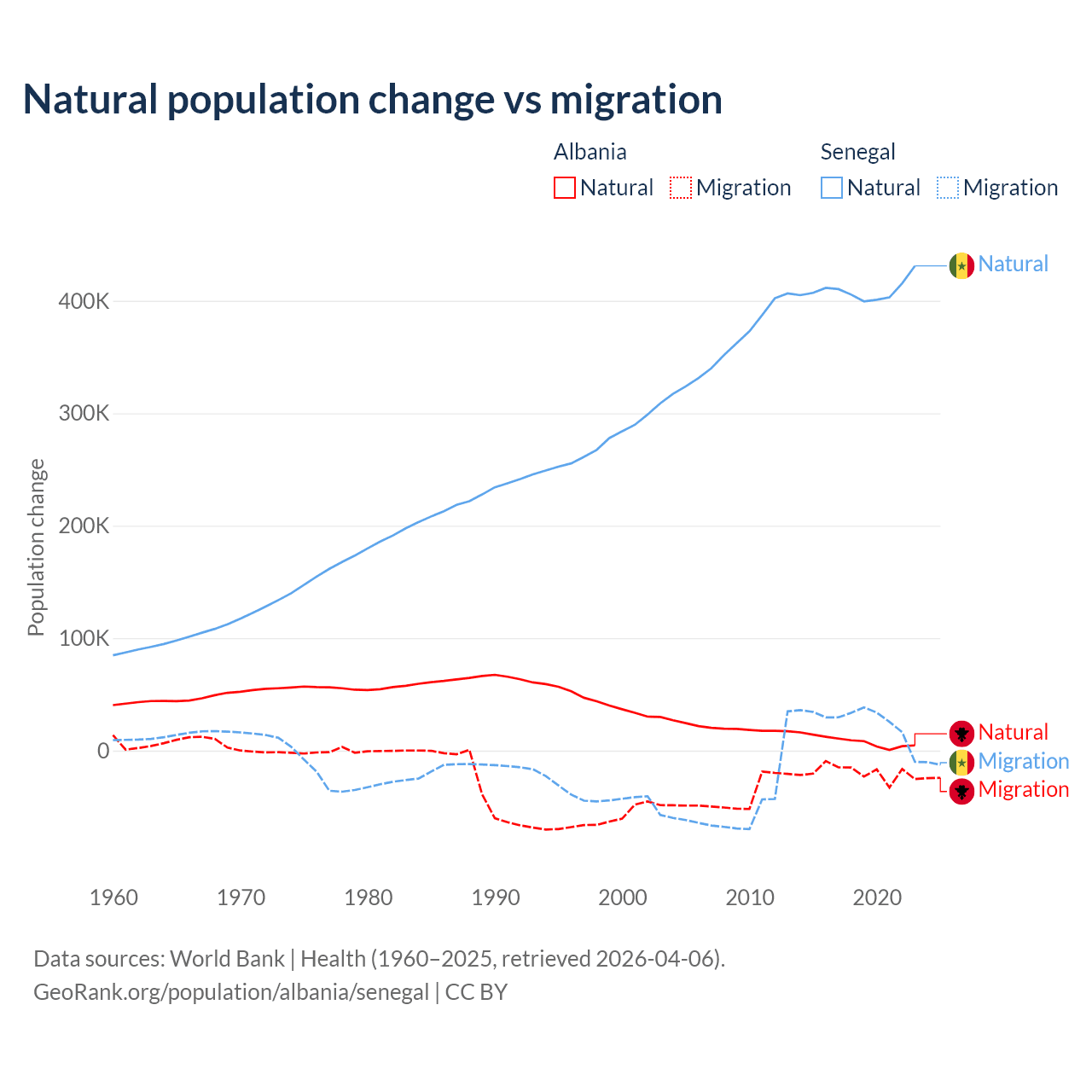Over the last 10 years, 30% of the population change in Albania is from natural causes (a gain of 83,840 people) and 70% is from migration (a loss of 195,891 people). In Senegal 93.9% is from natural causes (a gain of 4,089,205 people) and 6.13% is from migration (a gain of 267,266 people).