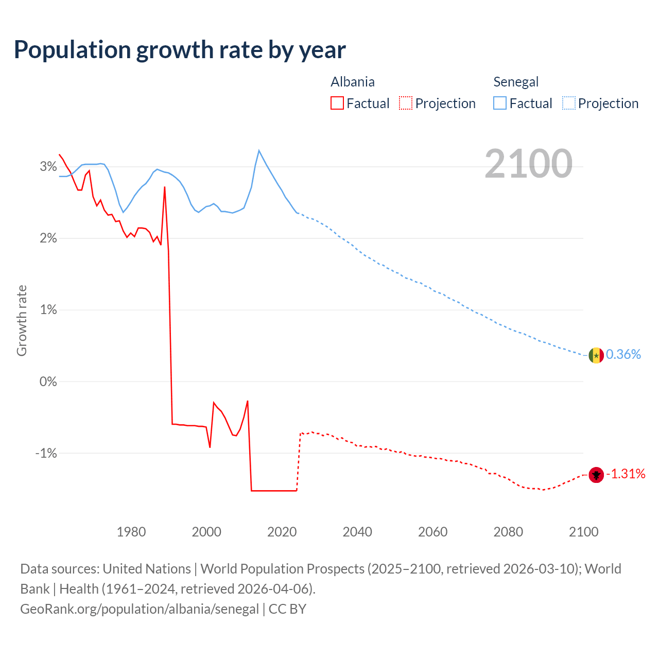 - For the last 10 years, Albania has had an average growth rate of -1.53% per year vs +2.76% in Senegal.