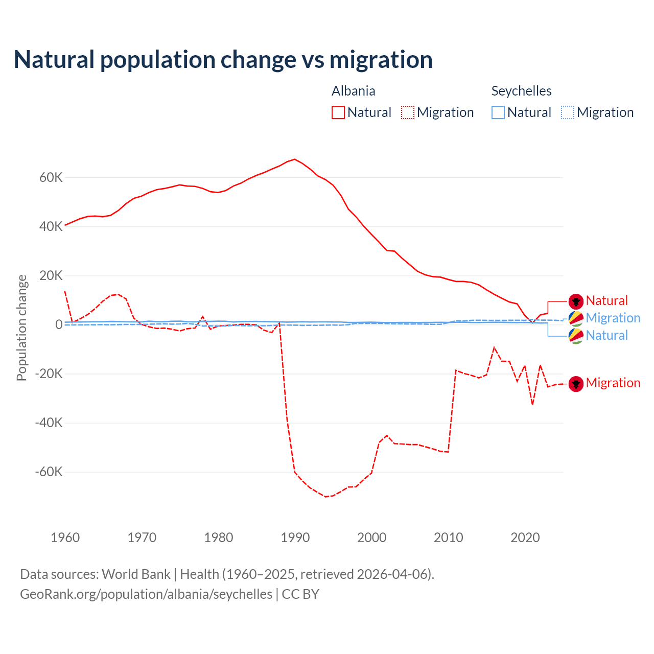 Over the last 10 years, 30% of the population change in Albania is from natural causes (a gain of 83,840 people) and 70% is from migration (a loss of 195,891 people). In the Seychelles 31.4% is from natural causes (a gain of 8,122 people) and 68.6% is from migration (a gain of 17,748 people).