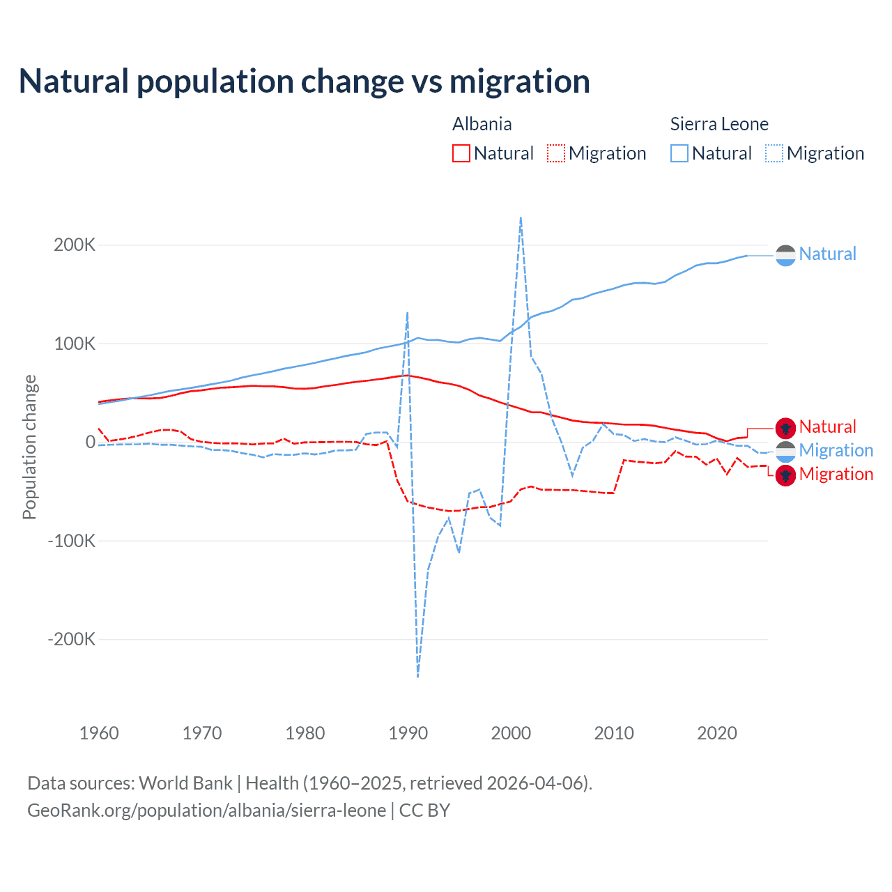 Over the last 10 years, 30% of the population change in Albania is from natural causes (a gain of 83,840 people) and 70% is from migration (a loss of 195,891 people). In Sierra Leone 99.6% is from natural causes (a gain of 1,764,049 people) and 0.41% is from migration (a loss of 7,211 people).