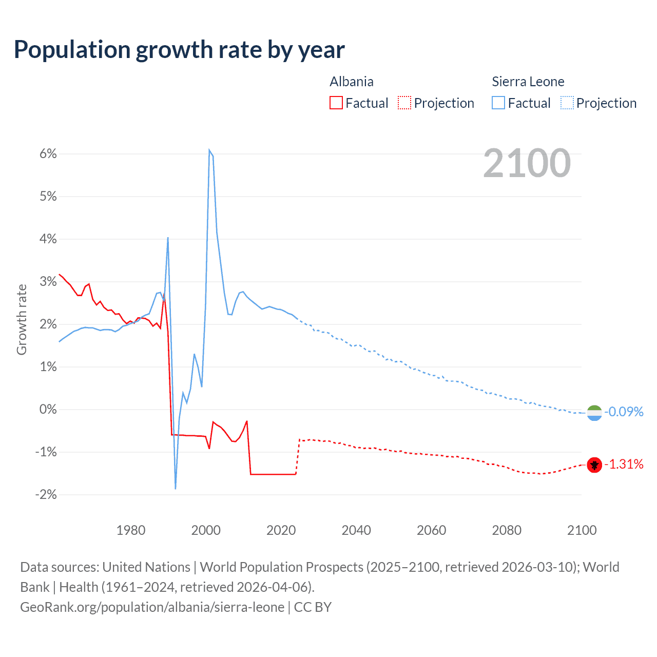 - For the last 10 years, Albania has had an average growth rate of -1.53% per year vs +2.32% in Sierra Leone.
