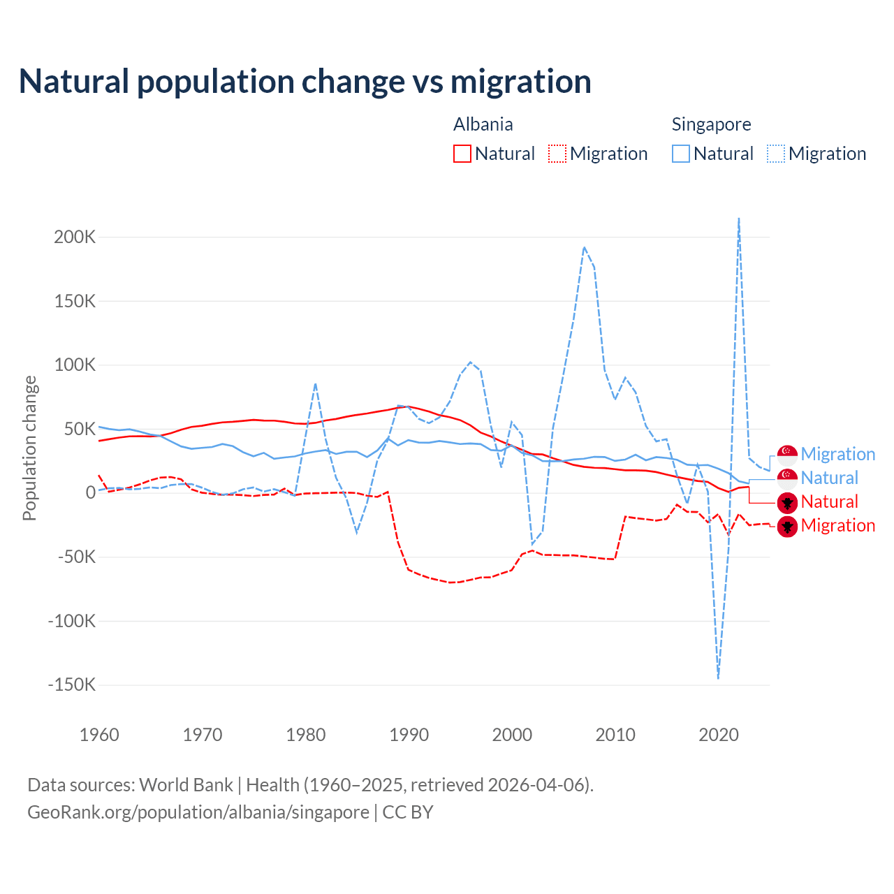 Over the last 10 years, 30% of the population change in Albania is from natural causes (a gain of 83,840 people) and 70% is from migration (a loss of 195,891 people). In Singapore 54.8% is from natural causes (a gain of 195,953 people) and 45.2% is from migration (a gain of 161,805 people).