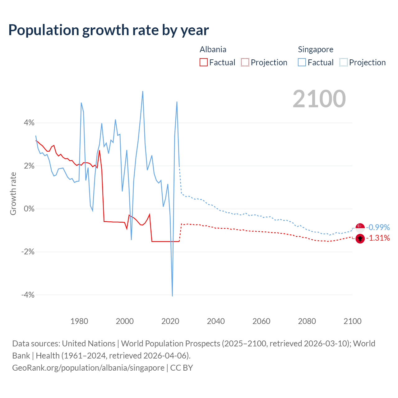 - For the last 10 years, Albania has had an average growth rate of -1.53% per year vs +1.04% in Singapore.