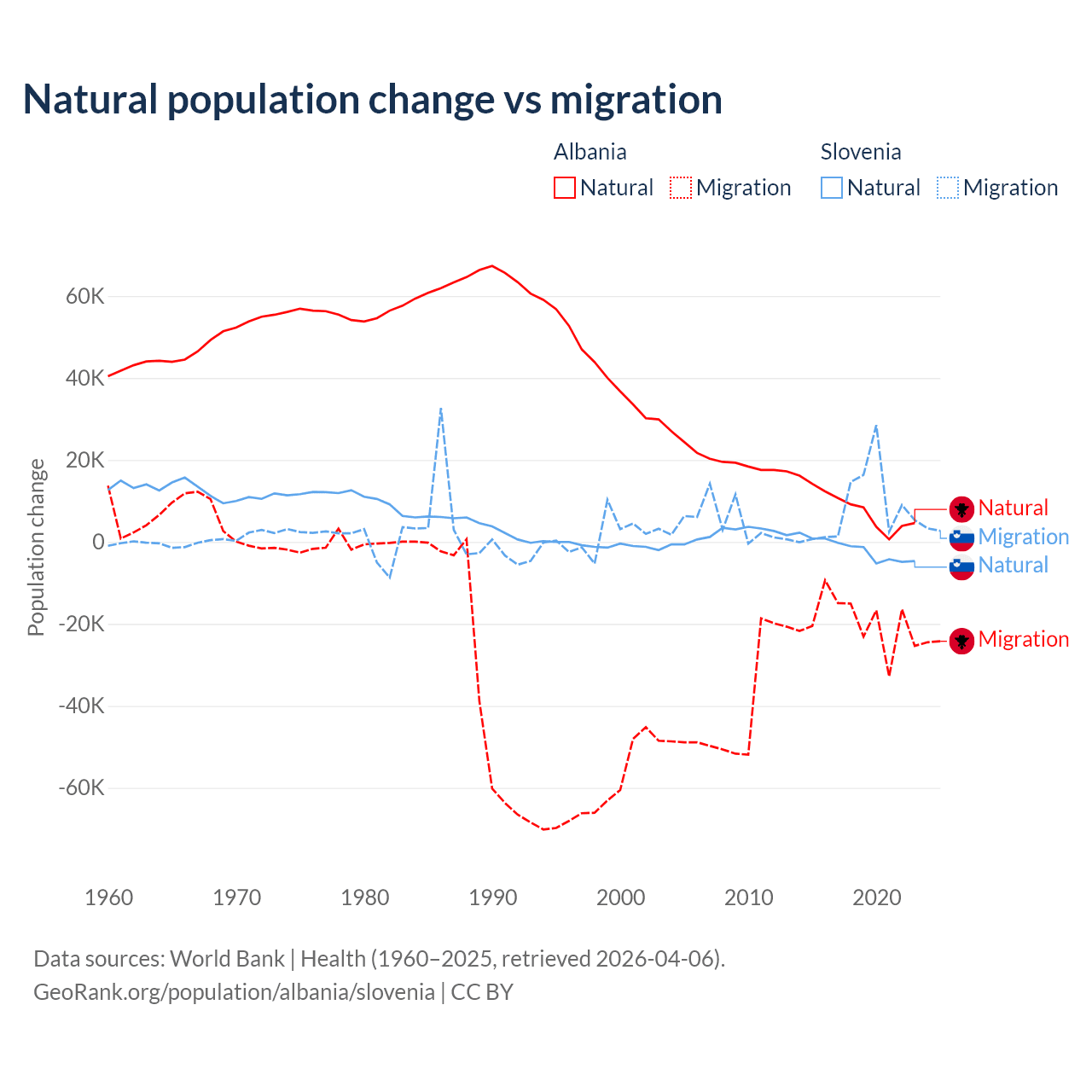 Over the last 10 years, 30% of the population change in Albania is from natural causes (a gain of 83,840 people) and 70% is from migration (a loss of 195,891 people). In Slovenia 18.1% is from natural causes (a loss of 17,573 people) and 81.9% is from migration (a gain of 79,532 people).