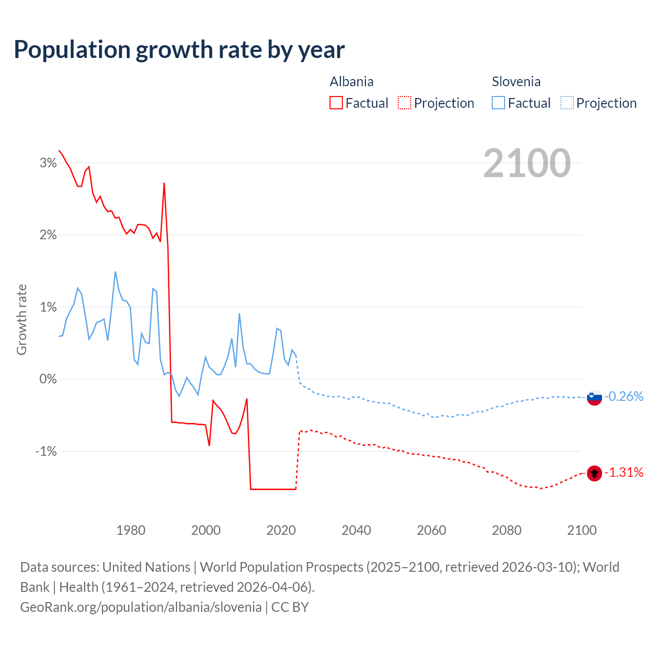 - For the last 10 years, Albania has had an average growth rate of -1.53% per year vs +0.29% in Slovenia.