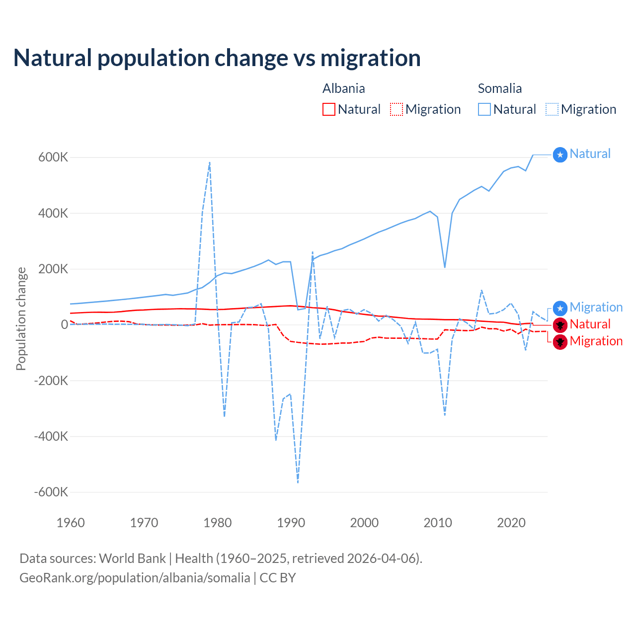 Over the last 10 years, 30% of the population change in Albania is from natural causes (a gain of 83,840 people) and 70% is from migration (a loss of 195,891 people). In Somalia 94.4% is from natural causes (a gain of 5,270,105 people) and 5.58% is from migration (a gain of 311,487 people).
