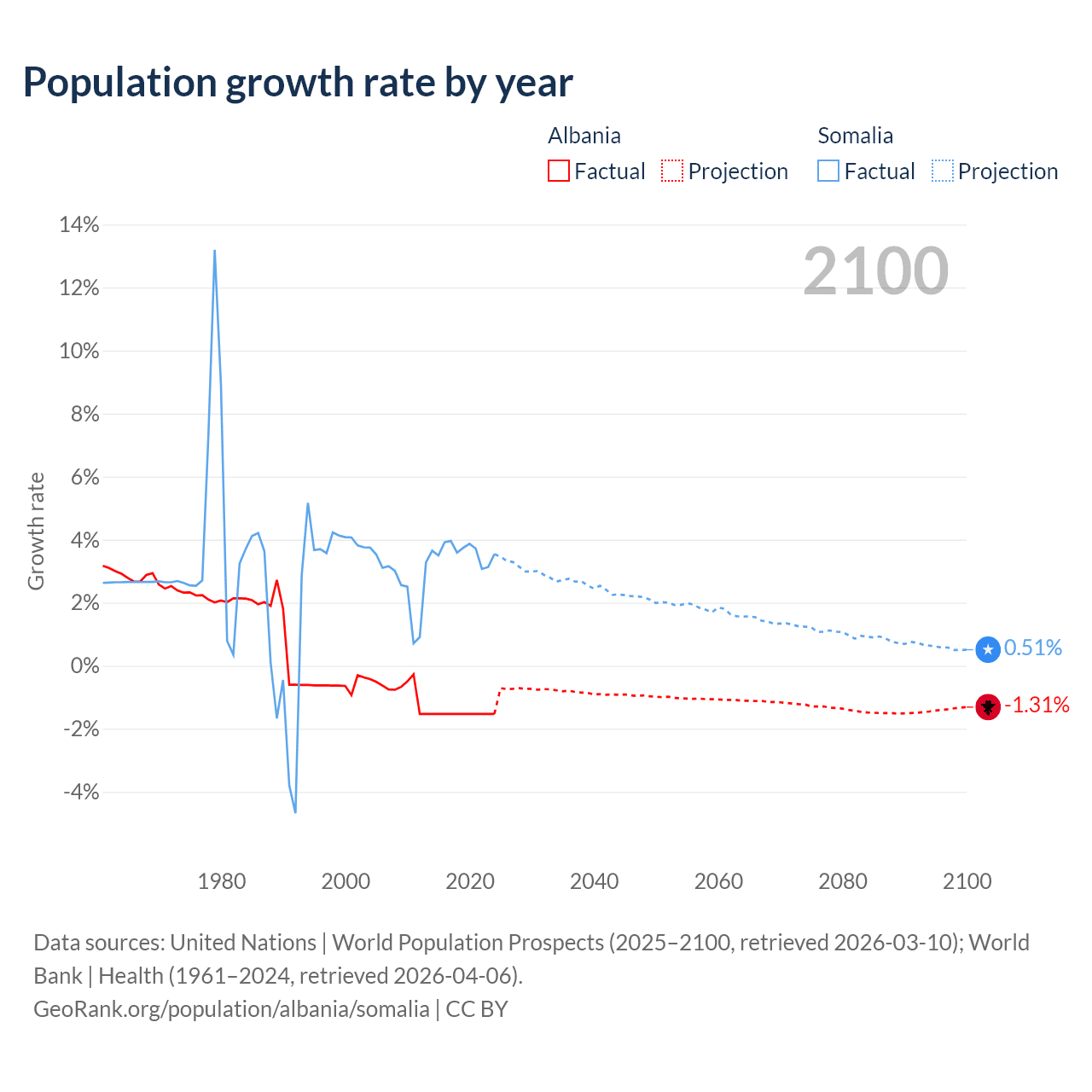 - For the last 10 years, Albania has had an average growth rate of -1.53% per year vs +3.61% in Somalia.