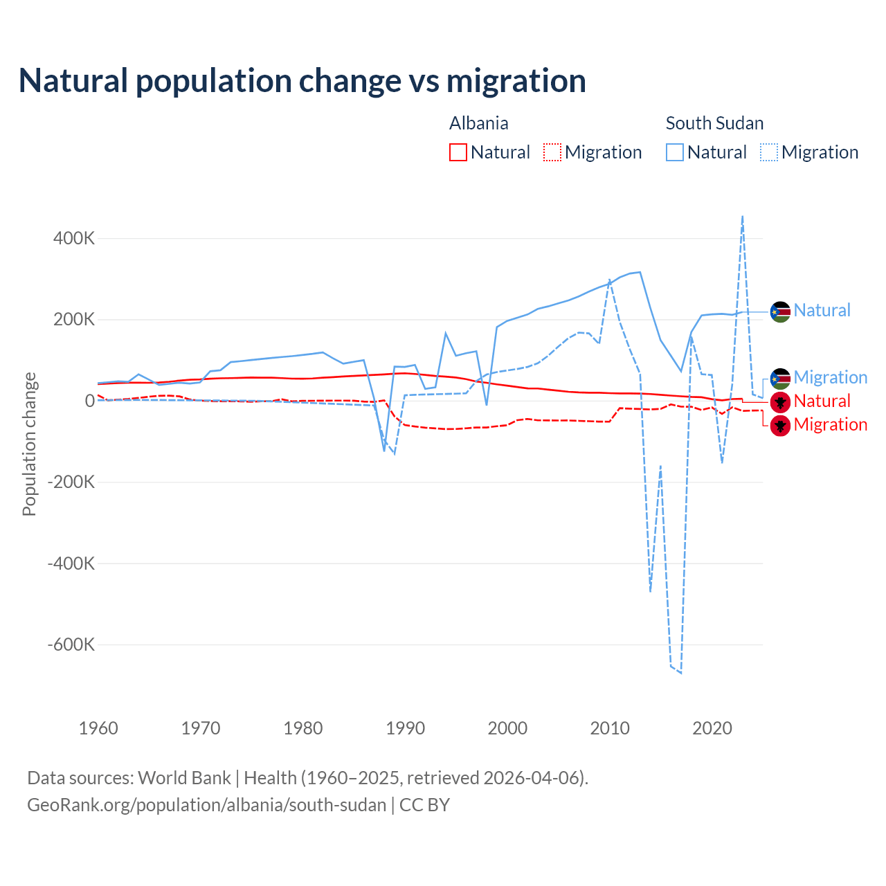 Over the last 10 years, 30% of the population change in Albania is from natural causes (a gain of 83,840 people) and 70% is from migration (a loss of 195,891 people). In South Sudan 57.4% is from natural causes (a gain of 1,792,135 people) and 42.6% is from migration (a loss of 1,329,606 people).