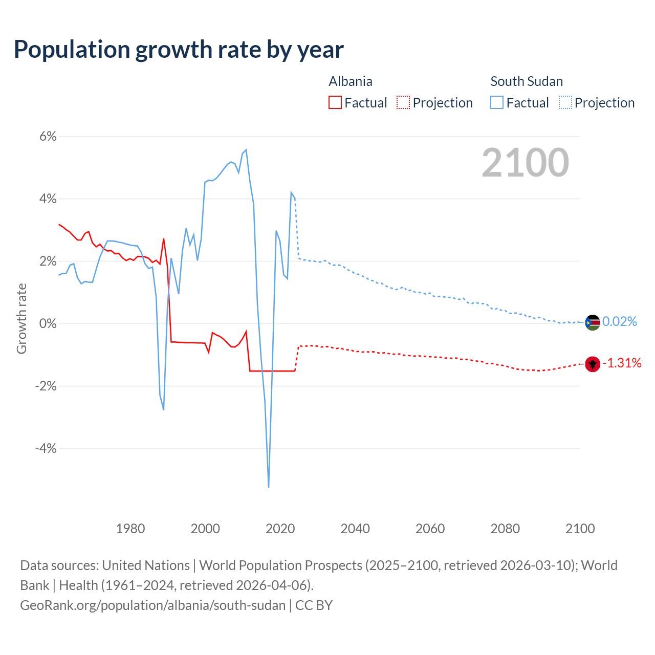 - For the last 10 years, Albania has had an average growth rate of -1.53% per year vs +0.65% in South Sudan.