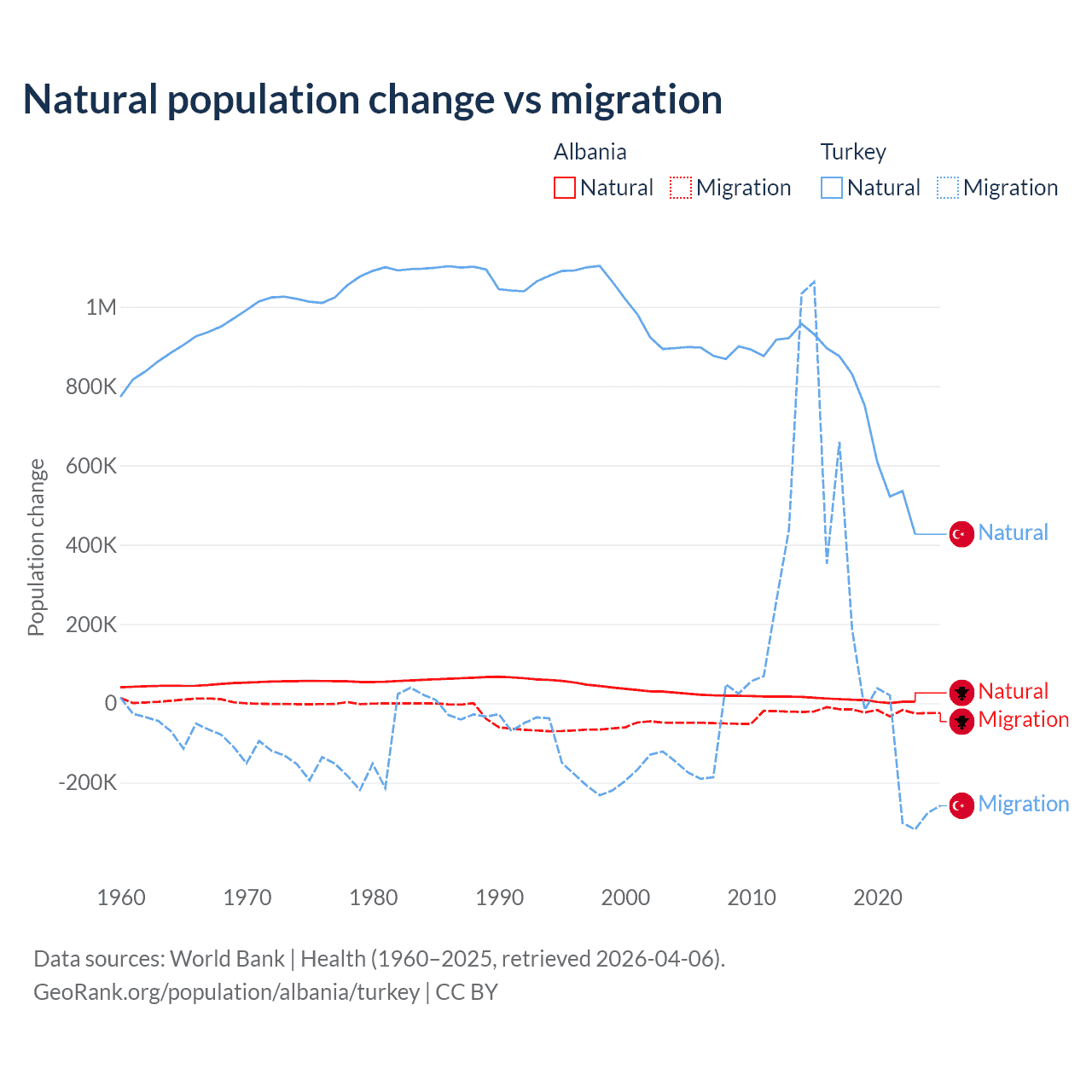 Over the last 10 years, 30% of the population change in Albania is from natural causes (a gain of 83,840 people) and 70% is from migration (a loss of 195,891 people). In Turkey 73% is from natural causes (a gain of 7,333,352 people) and 27% is from migration (a gain of 2,718,916 people).
