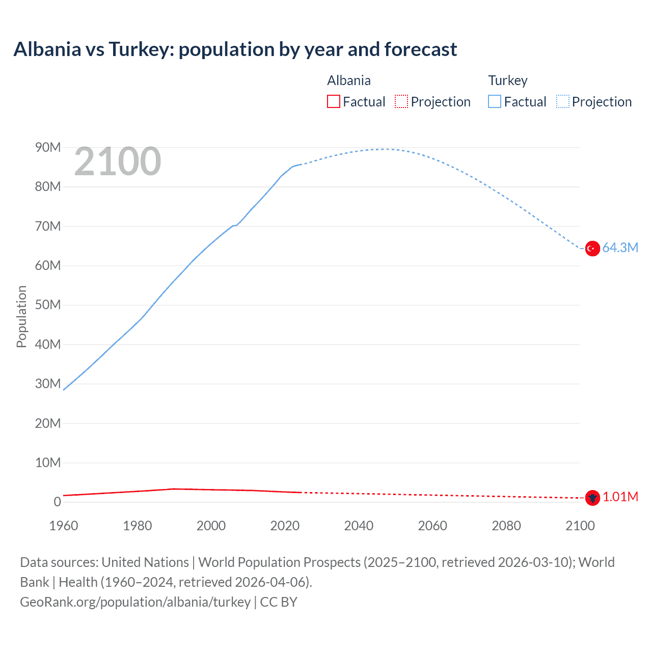 The latest officially reported population of Albania was 2,377,128 in 2024 vs 85,518,661 people in Turkey in 2024. In 2026, based on the adjusted UN estimation, the current Albania's population is 2,342,753 people compared to 86,002,379 in Turkey.
