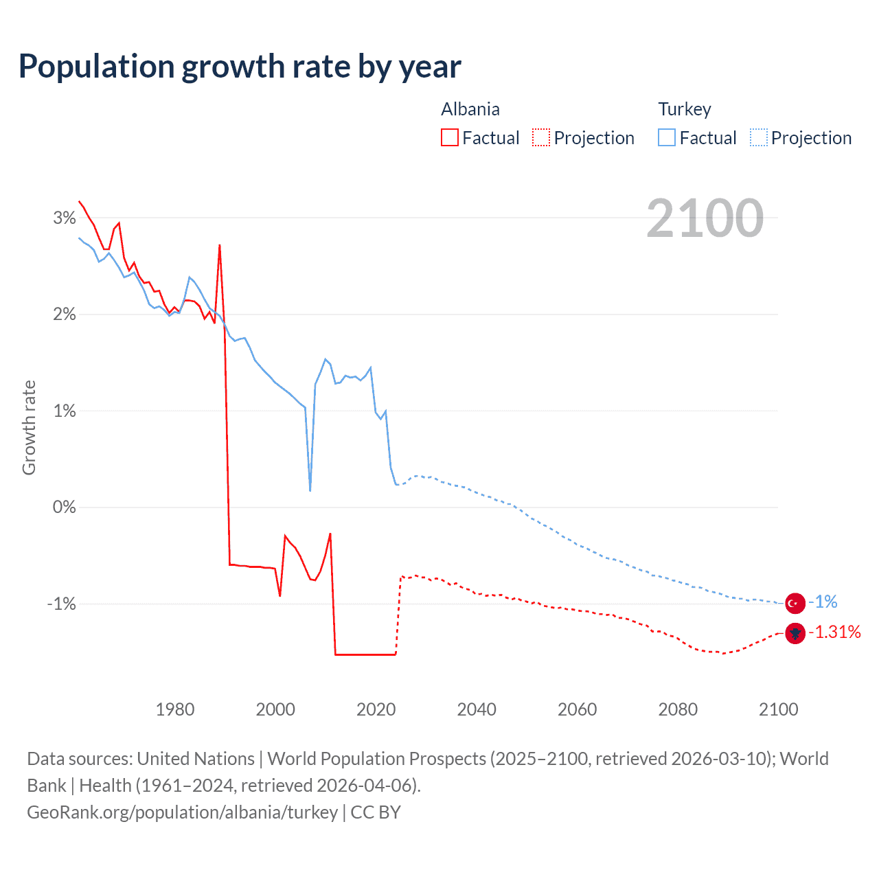 - For the last 10 years, Albania has had an average growth rate of -1.53% per year vs +1.06% in Turkey.