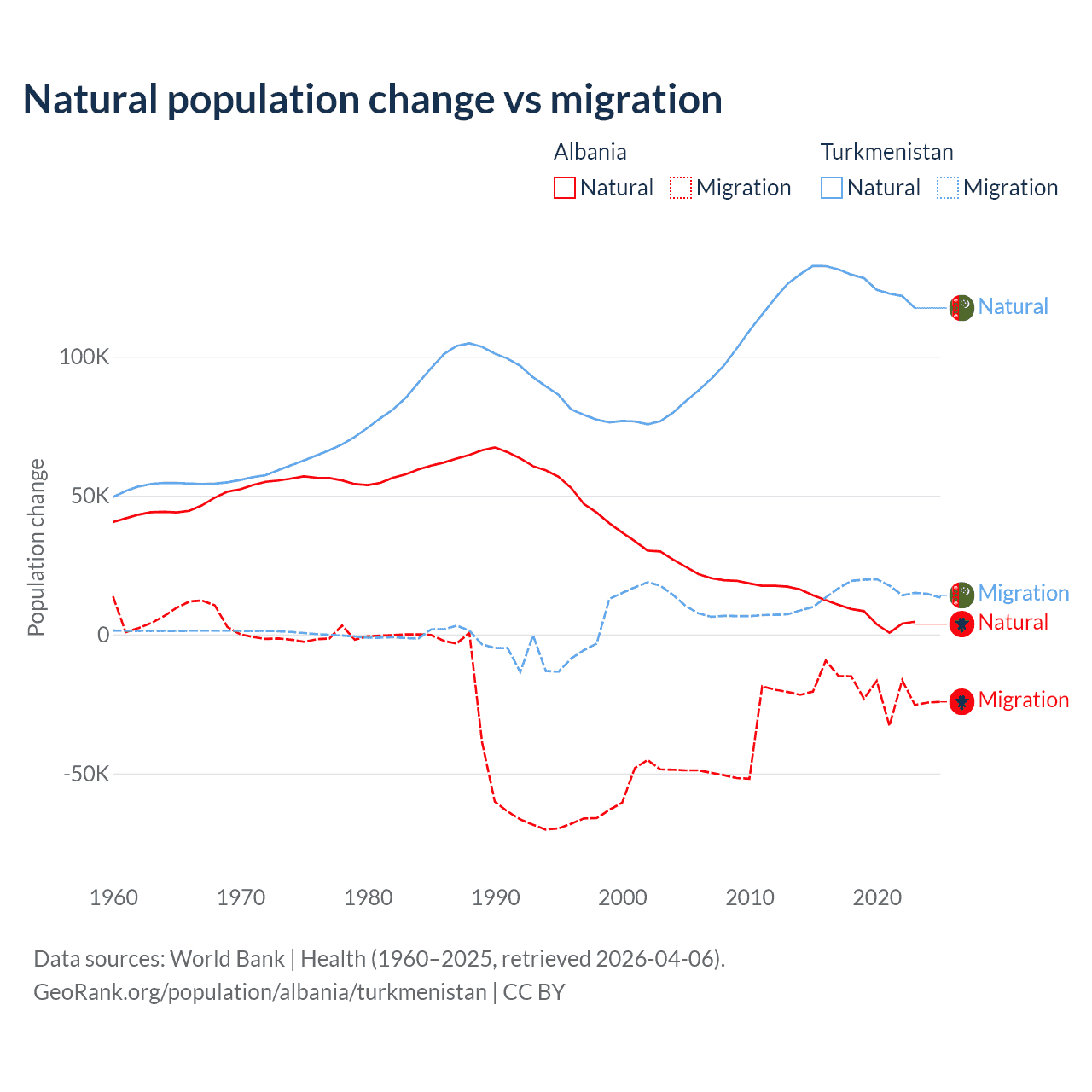 Over the last 10 years, 30% of the population change in Albania is from natural causes (a gain of 83,840 people) and 70% is from migration (a loss of 195,891 people). In Turkmenistan 89.2% is from natural causes (a gain of 1,270,228 people) and 10.8% is from migration (a gain of 154,379 people).