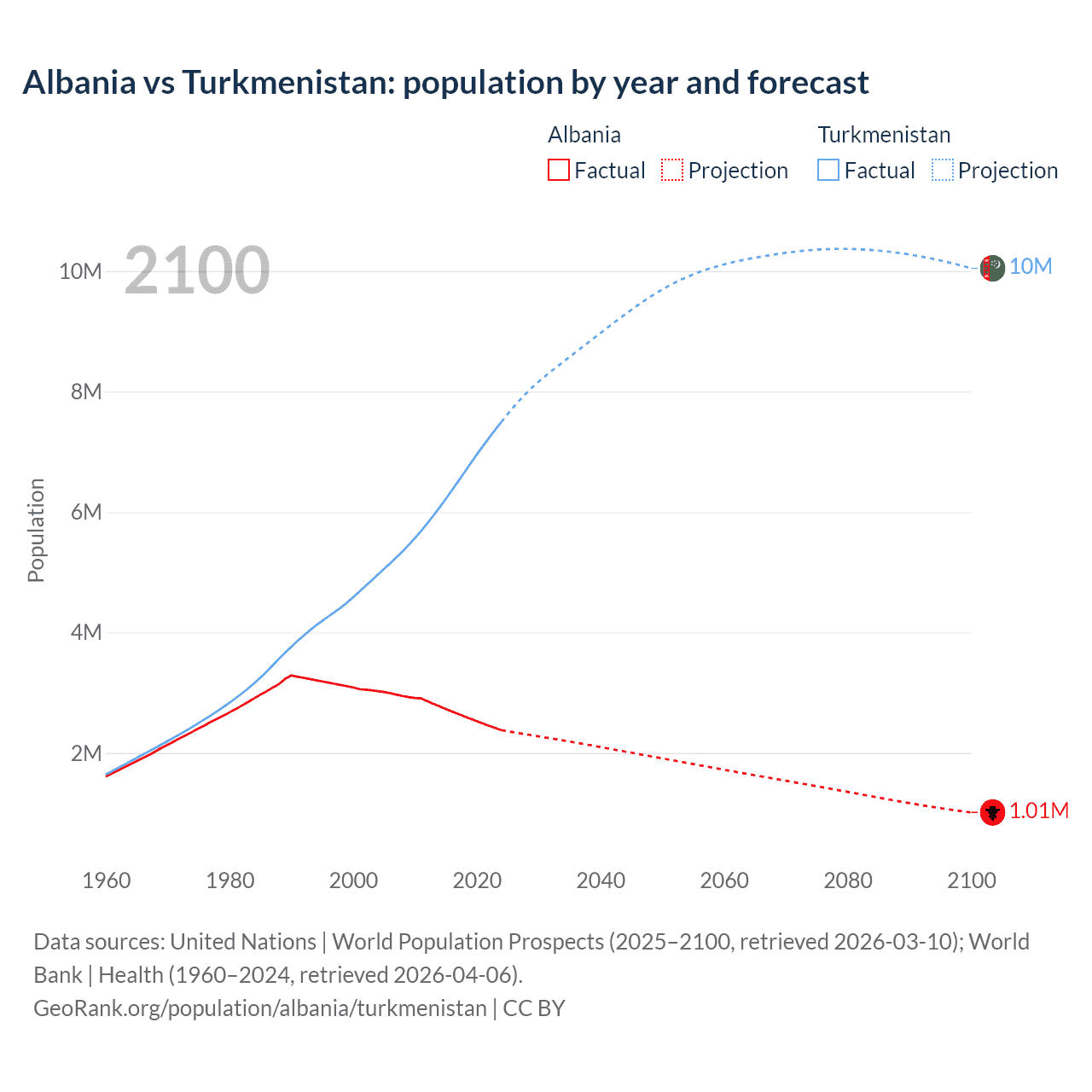 The latest officially reported population of Albania was 2,377,128 in 2024 vs 7,494,498 people in Turkmenistan in 2024. In 2026, based on the adjusted UN estimation, the current Albania's population is 2,342,753 people compared to 7,776,557 in Turkmenistan.