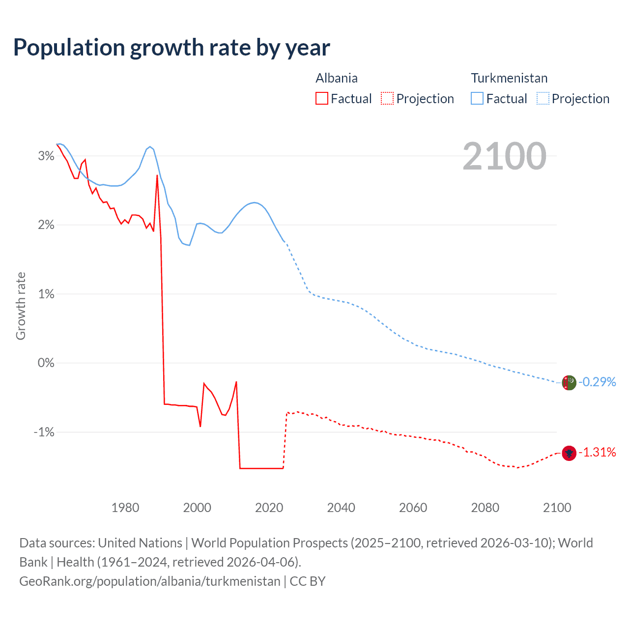 - For the last 10 years, Albania has had an average growth rate of -1.53% per year vs +2.14% in Turkmenistan.