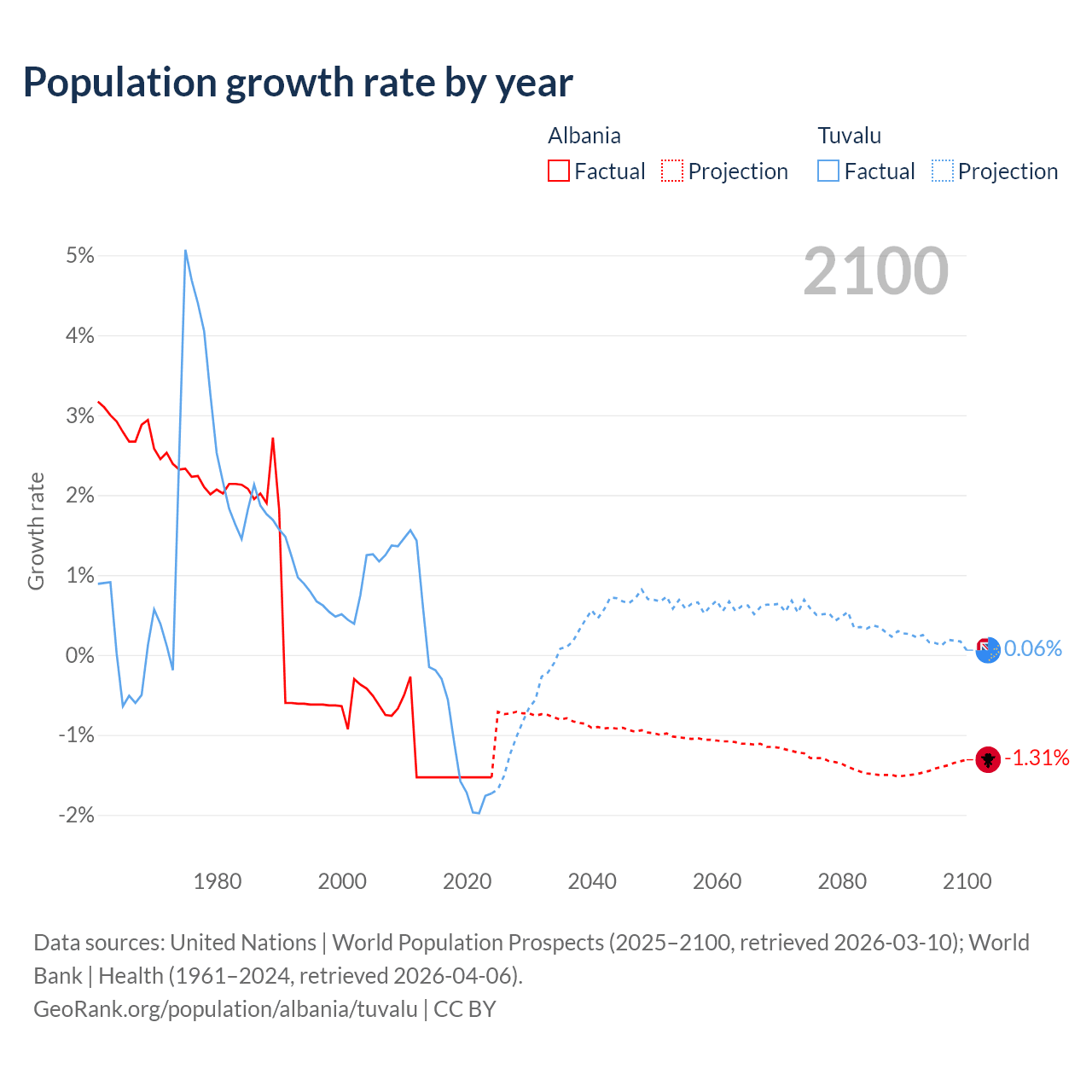 - For the last 10 years, Albania has had an average growth rate of -1.53% per year vs -1.19% in Tuvalu.