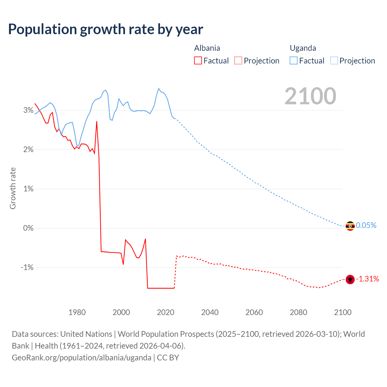 - For the last 10 years, Albania has had an average growth rate of -1.53% per year vs +3.21% in Uganda.