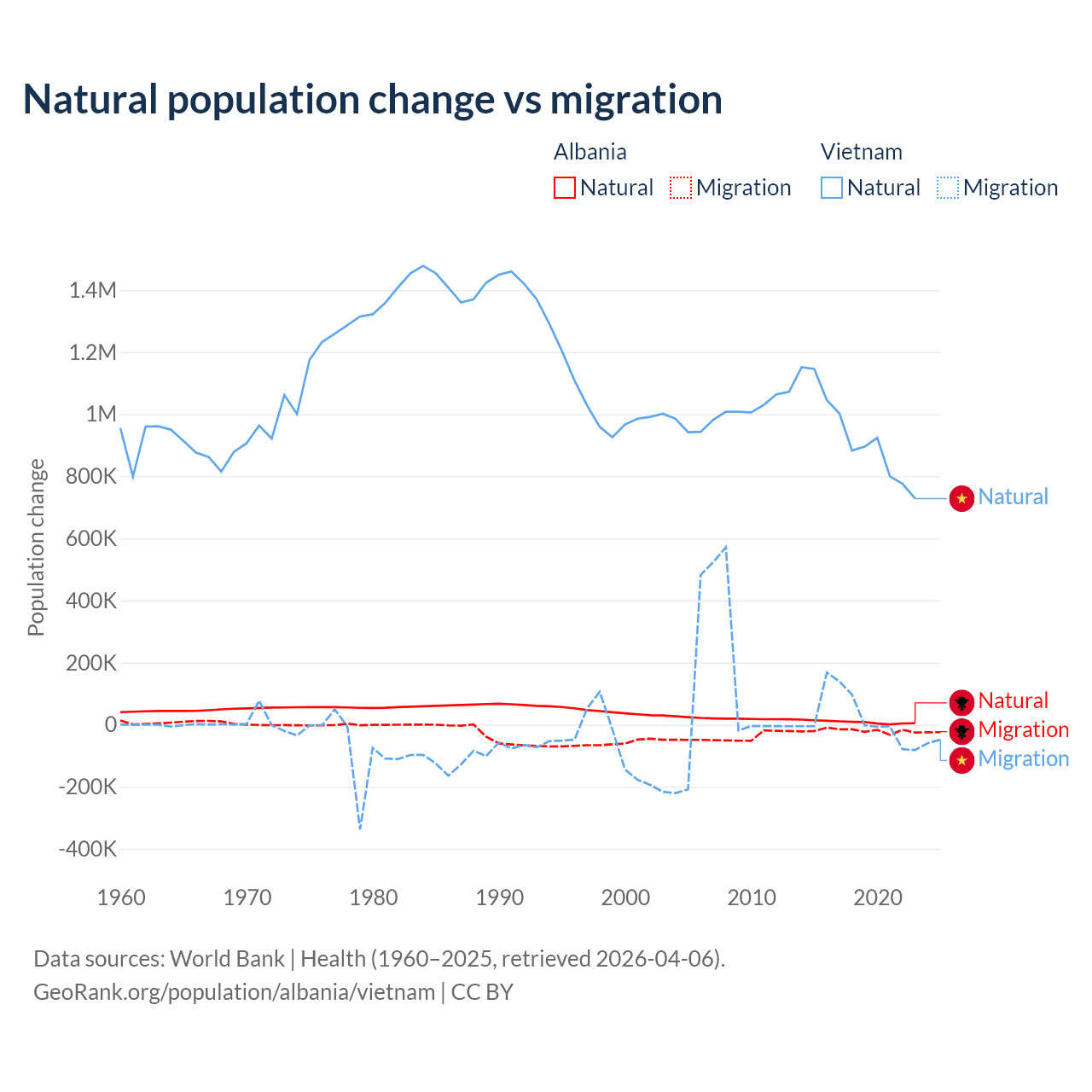 Over the last 10 years, 30% of the population change in Albania is from natural causes (a gain of 83,840 people) and 70% is from migration (a loss of 195,891 people). In Vietnam 97.7% is from natural causes (a gain of 9,349,756 people) and 2.29% is from migration (a gain of 219,073 people).
