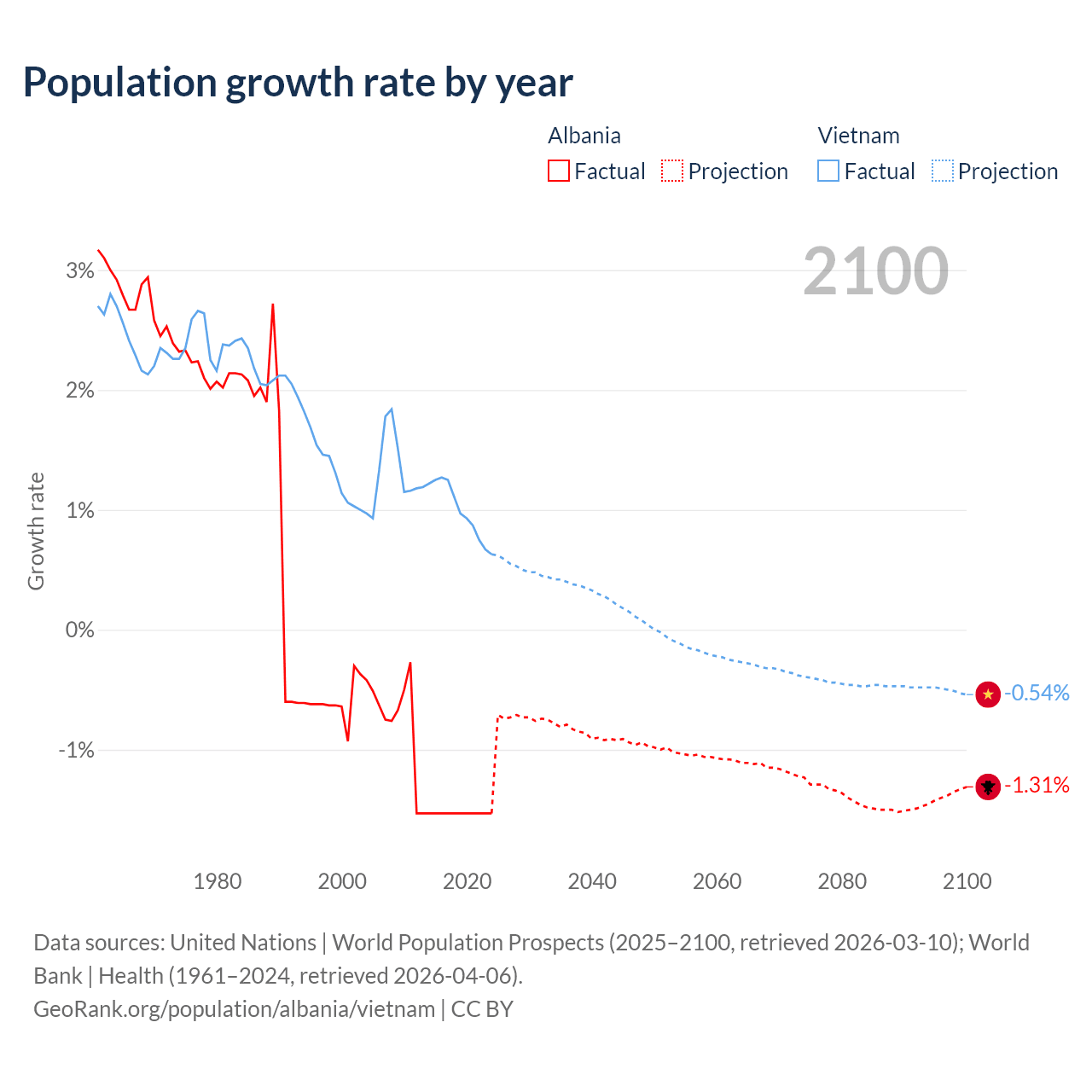 - For the last 10 years, Albania has had an average growth rate of -1.53% per year vs +0.99% in Vietnam.