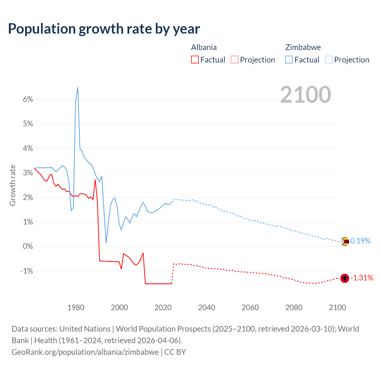 - For the last 10 years, Albania has had an average growth rate of -1.53% per year vs +1.57% in Zimbabwe.