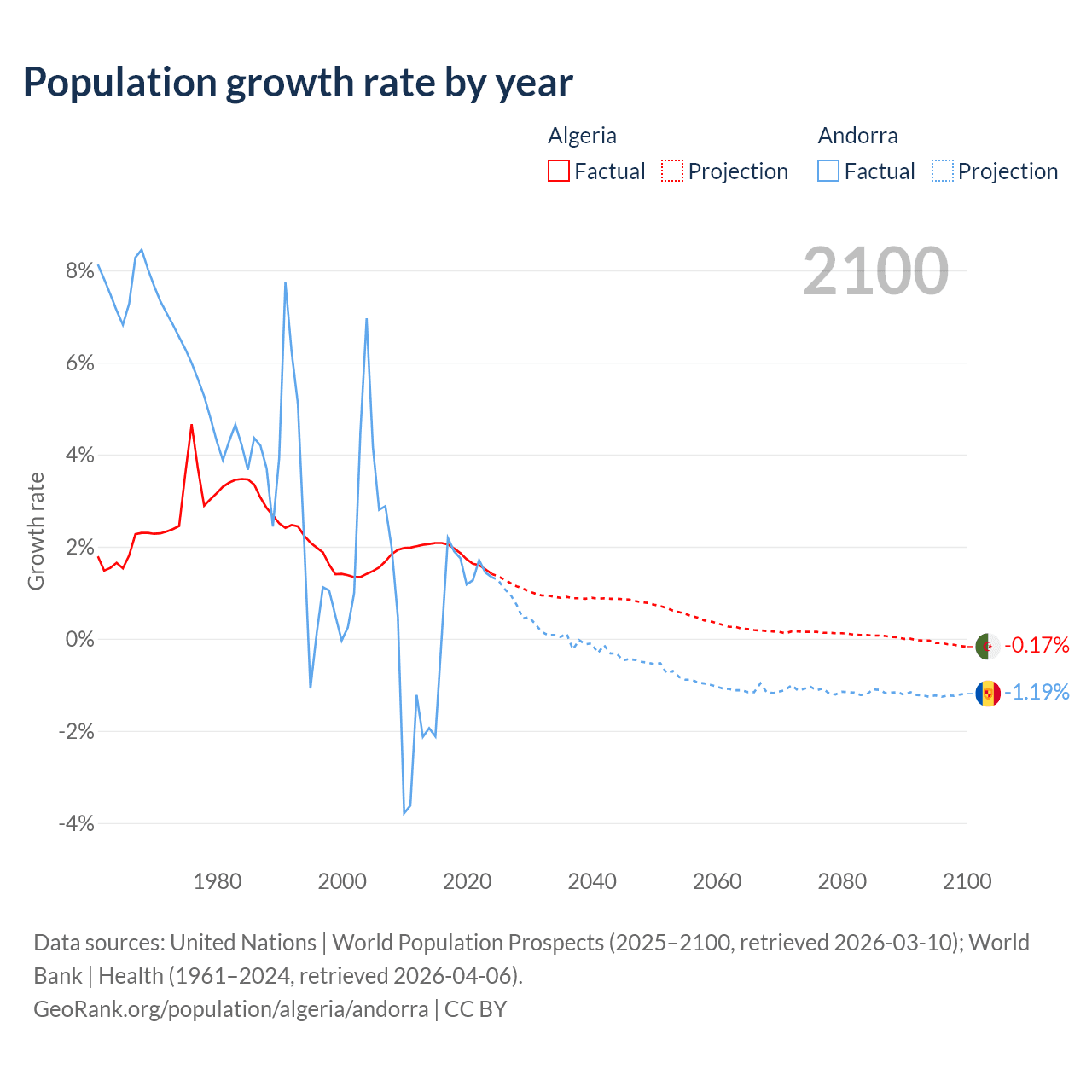 - For the last 10 years, Algeria has had an average growth rate of +1.81% per year vs +0.79% in Andorra.