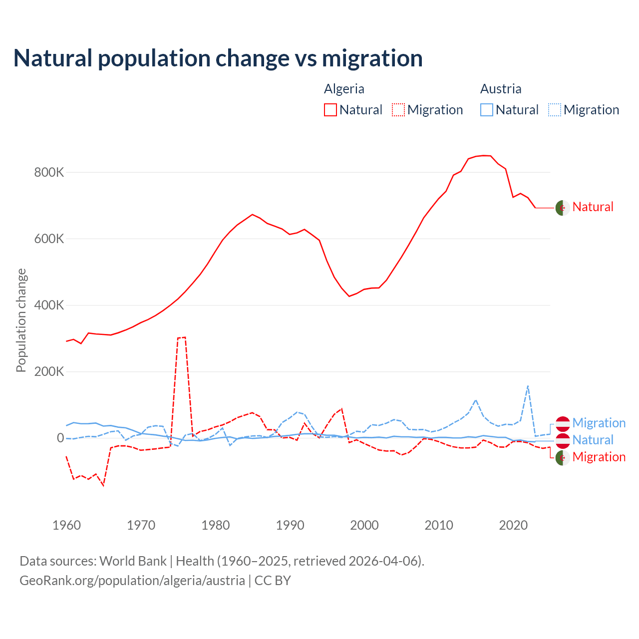 Over the last 10 years, 97.6% of the population change in Algeria is from natural causes (a gain of 7,892,580 people) and 2.42% is from migration (a loss of 195,723 people). In Austria 2.61% is from natural causes (a loss of 16,936 people) and 97.4% is from migration (a gain of 631,325 people).