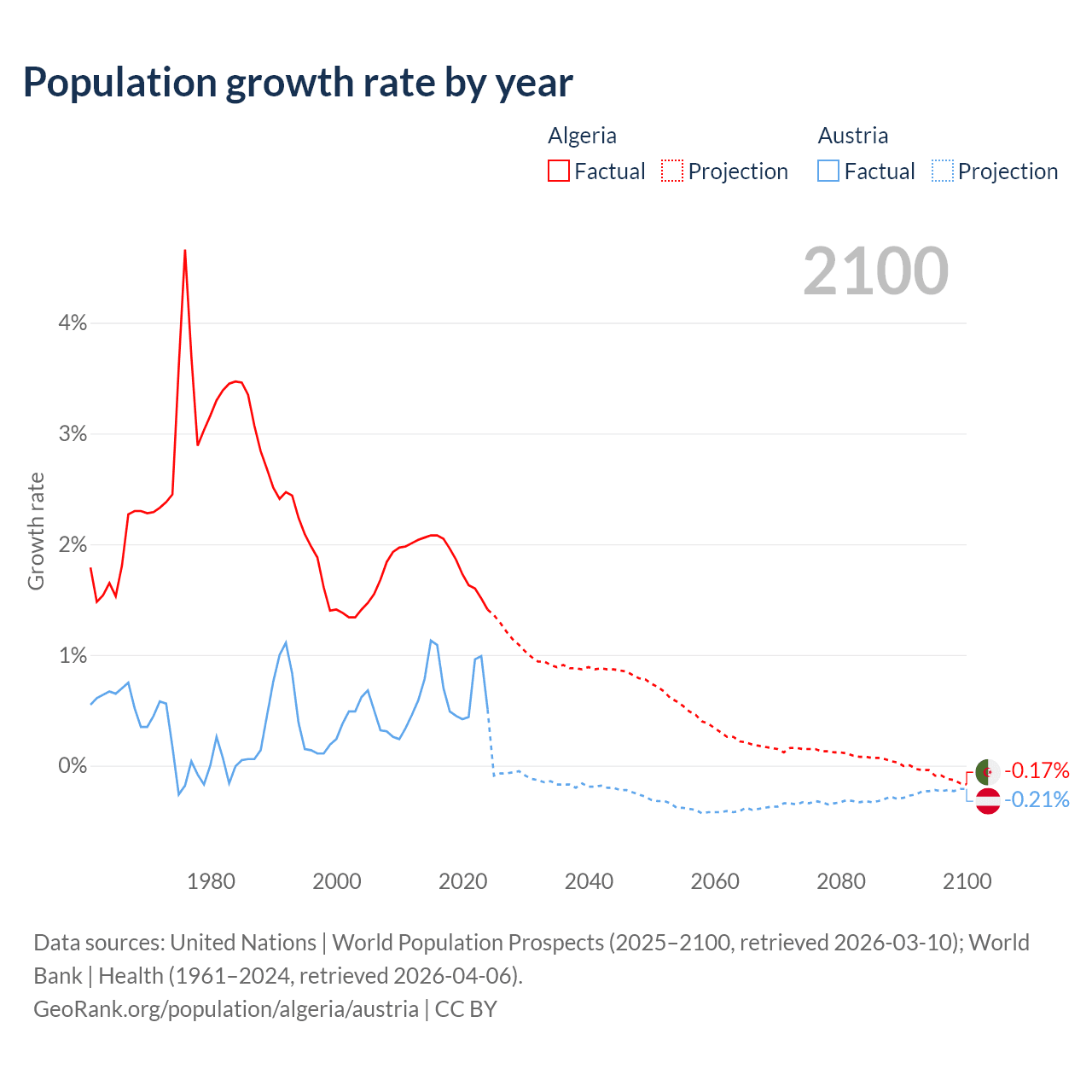 - For the last 10 years, Algeria has had an average growth rate of +1.81% per year vs +0.72% in Austria.