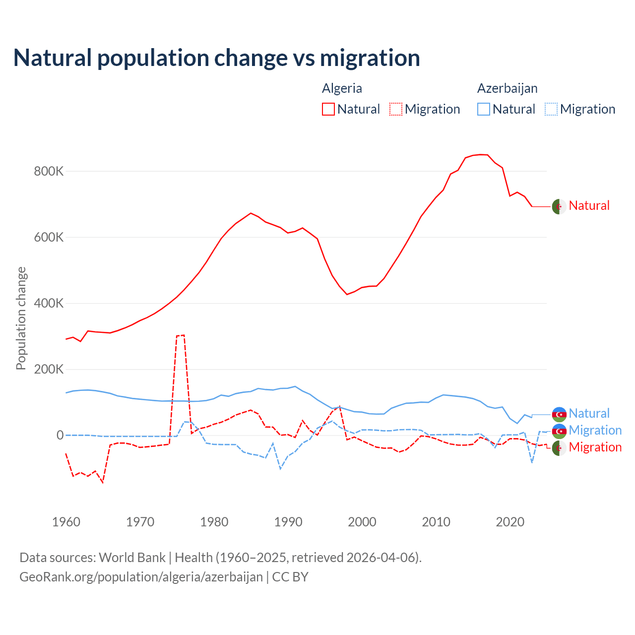 Over the last 10 years, 97.6% of the population change in Algeria is from natural causes (a gain of 7,892,580 people) and 2.42% is from migration (a loss of 195,723 people). In Azerbaijan 87.2% is from natural causes (a gain of 782,840 people) and 12.8% is from migration (a loss of 114,572 people).
