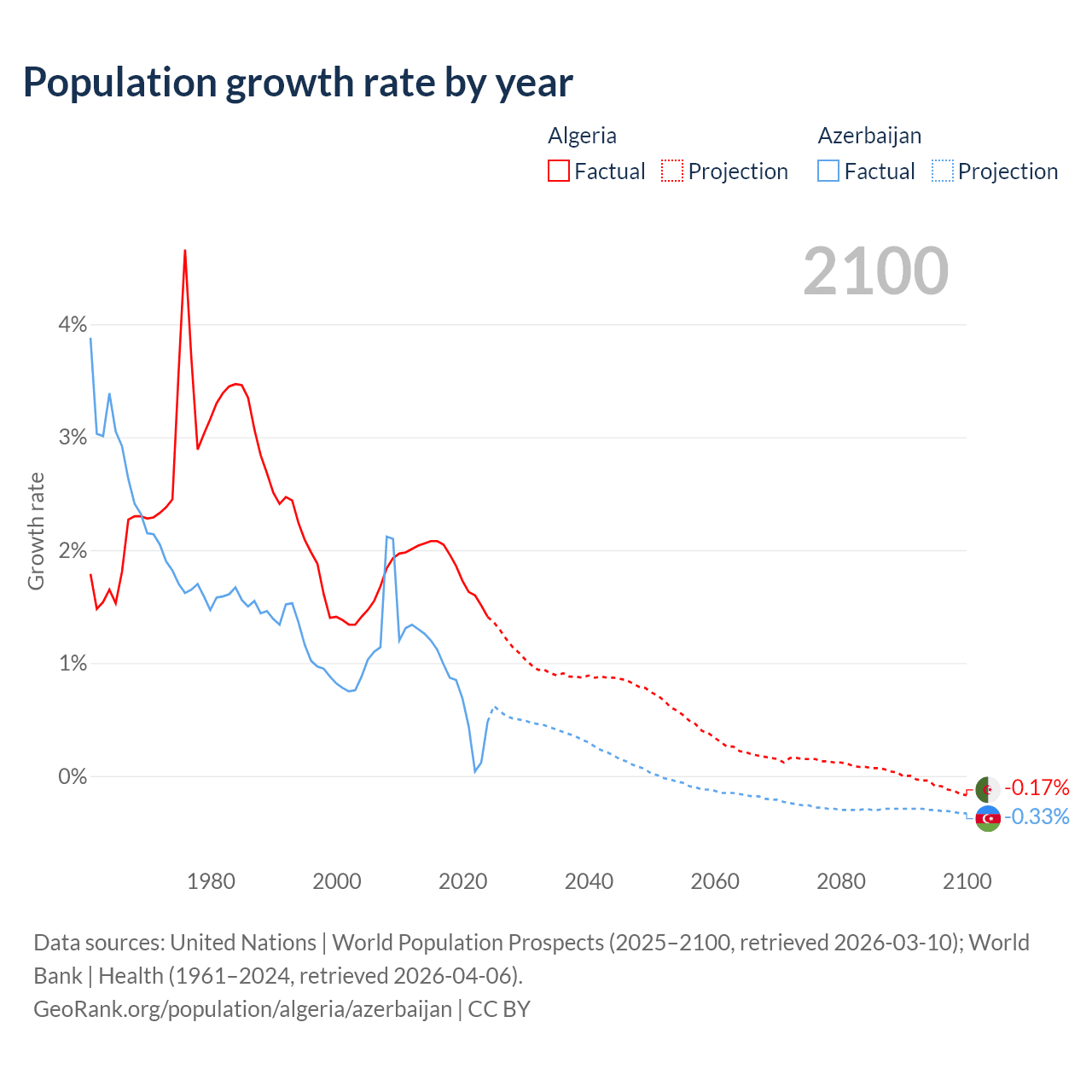 - For the last 10 years, Algeria has had an average growth rate of +1.81% per year vs +0.73% in Azerbaijan.