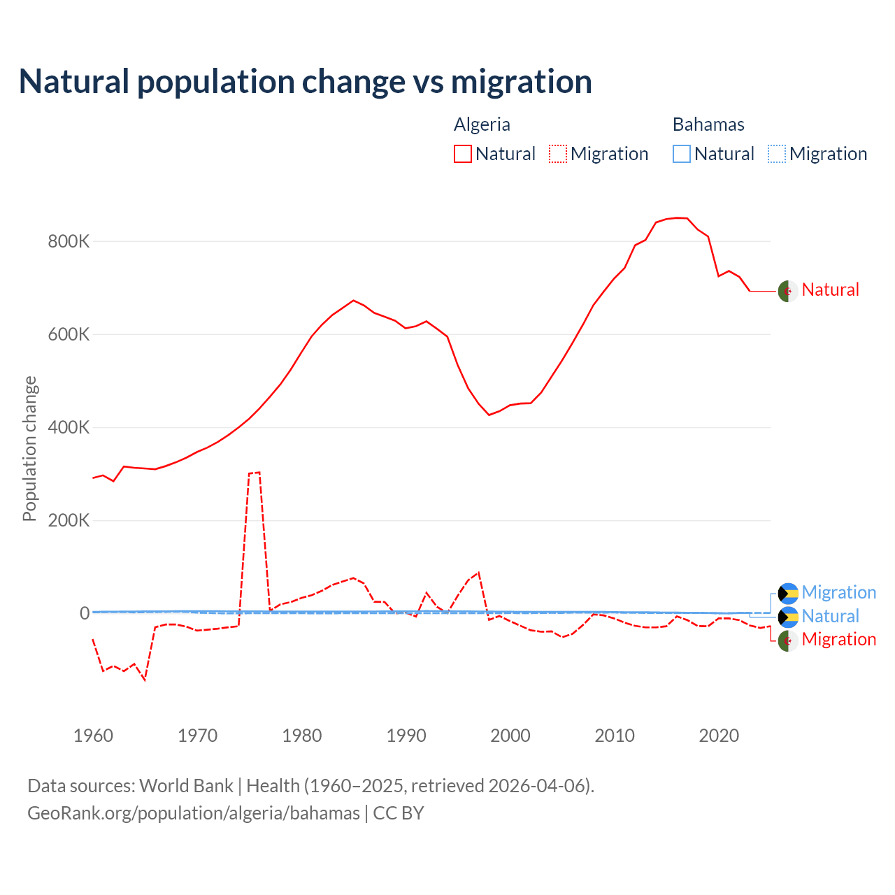 Over the last 10 years, 97.6% of the population change in Algeria is from natural causes (a gain of 7,892,580 people) and 2.42% is from migration (a loss of 195,723 people). In the Bahamas 56.9% is from natural causes (a gain of 11,209 people) and 43.1% is from migration (a gain of 8,495 people).