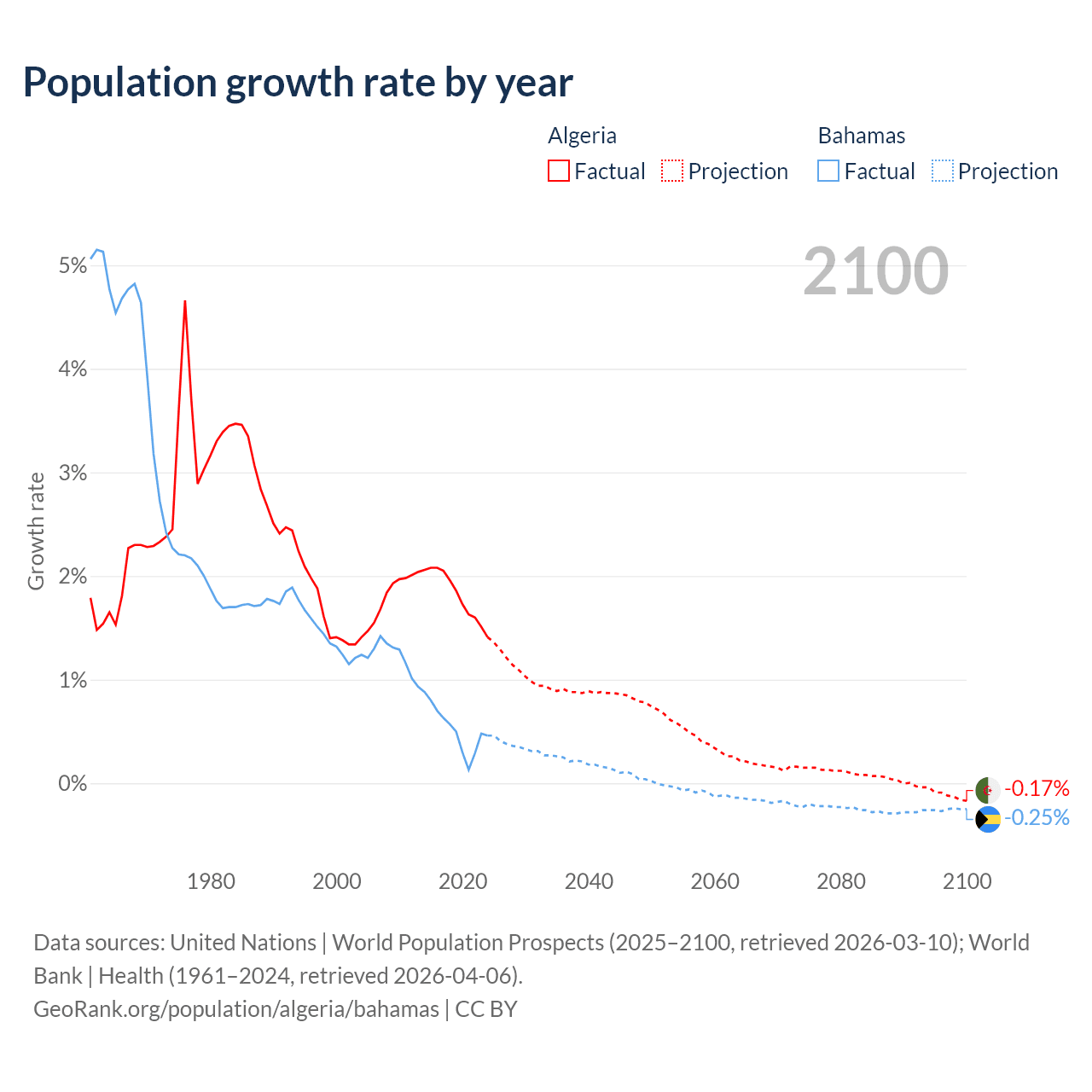 - For the last 10 years, Algeria has had an average growth rate of +1.81% per year vs +0.52% in the Bahamas.