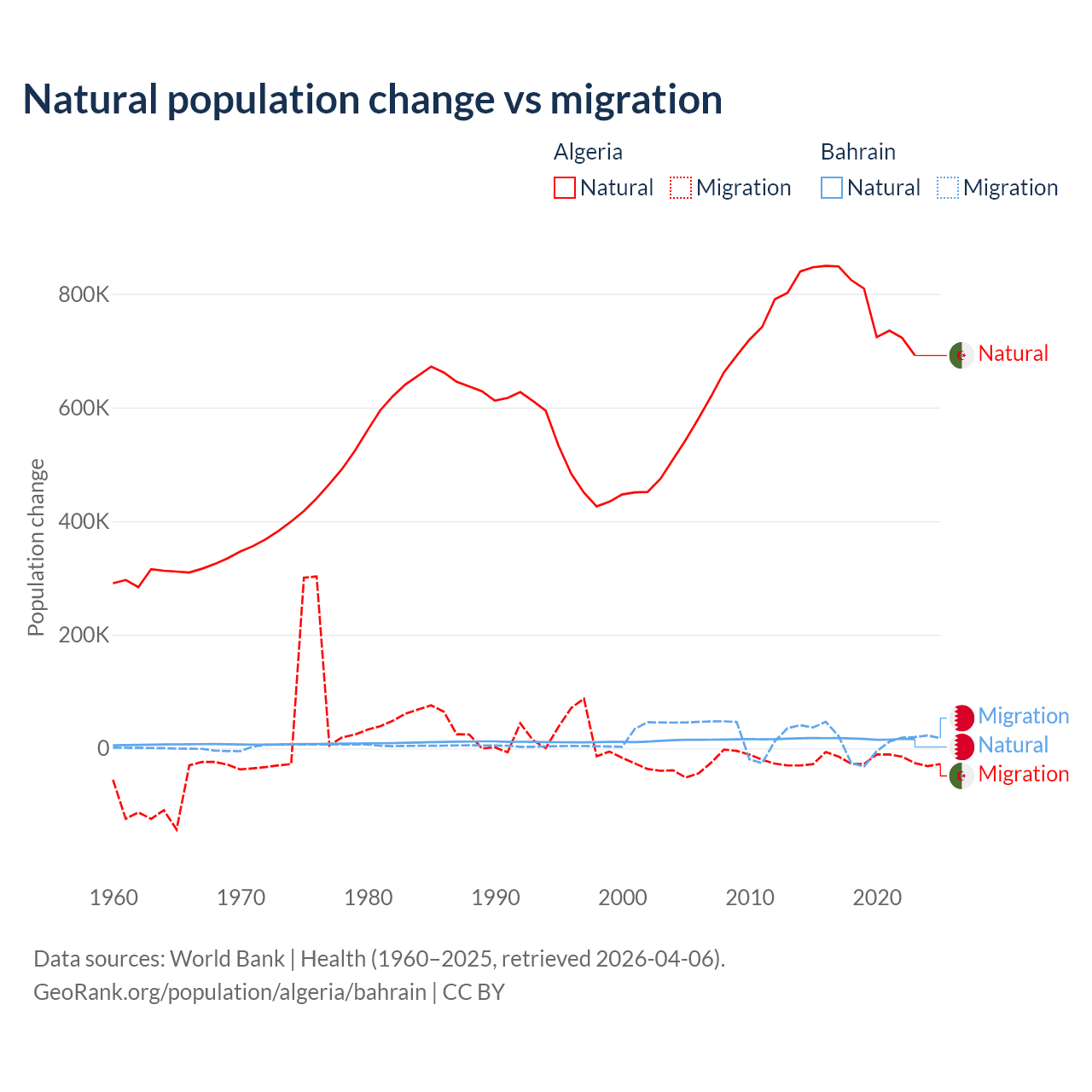 Over the last 10 years, 97.6% of the population change in Algeria is from natural causes (a gain of 7,892,580 people) and 2.42% is from migration (a loss of 195,723 people). In Bahrain 55.9% is from natural causes (a gain of 170,110 people) and 44.1% is from migration (a gain of 134,281 people).