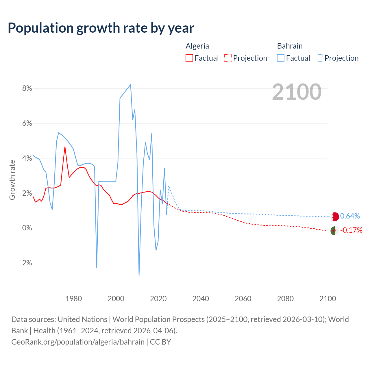 - For the last 10 years, Algeria has had an average growth rate of +1.81% per year vs +2.2% in Bahrain.