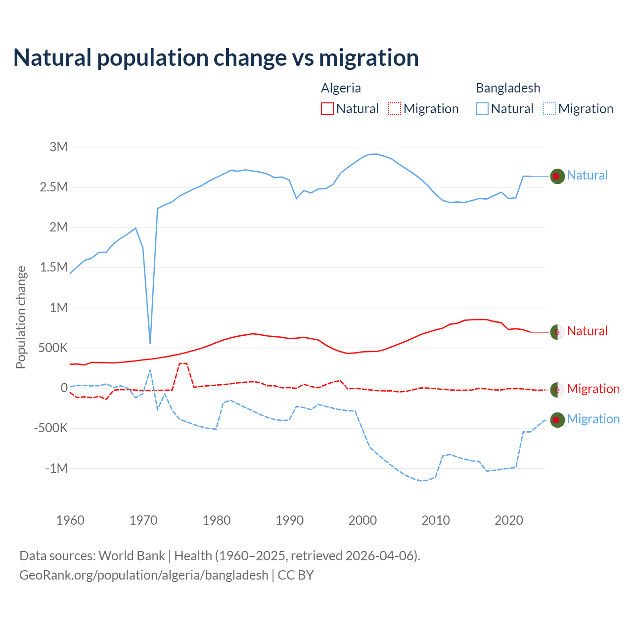 Over the last 10 years, 97.6% of the population change in Algeria is from natural causes (a gain of 7,892,580 people) and 2.42% is from migration (a loss of 195,723 people). In Bangladesh 73.1% is from natural causes (a gain of 24,148,039 people) and 26.9% is from migration (a loss of 8,897,408 people).