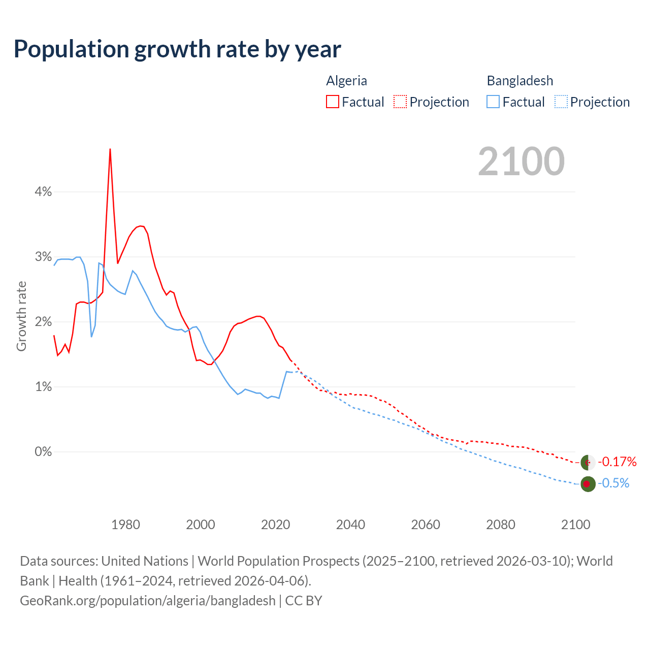 - For the last 10 years, Algeria has had an average growth rate of +1.81% per year vs +0.94% in Bangladesh.